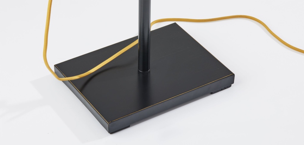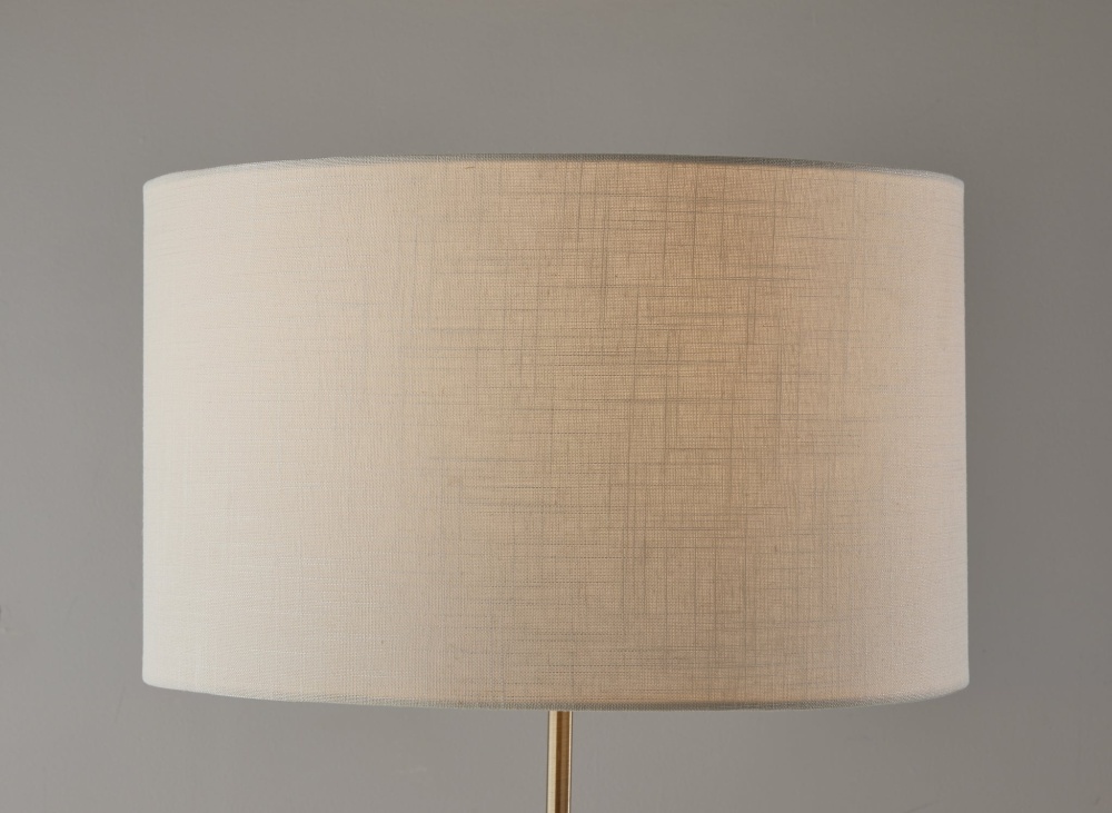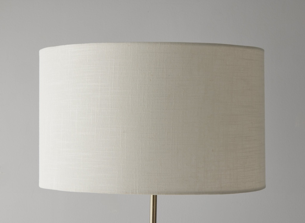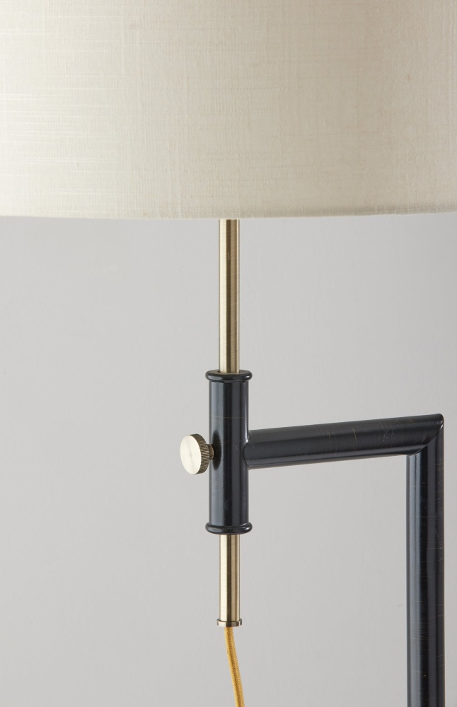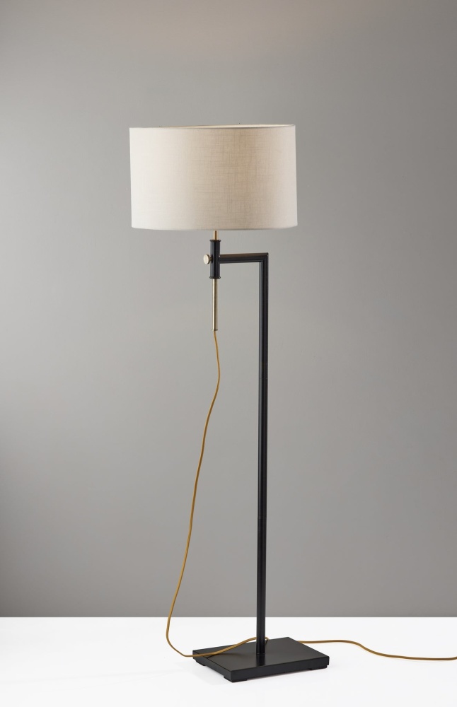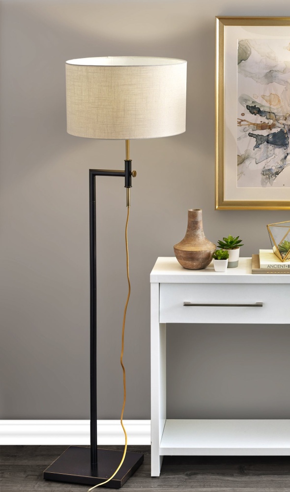 The adjustable height Winthrop floor lamp merges function and mid-century style for the perfect lighting solution for any space. The antique bronze body with brass accents features clean lines rising from a rectangular base. The 1" diameter tube leads to a narrower brass tube that is adjustable, allowing you to vary the lamp height between 53" and 63" to suit your lighting needs. The lamp is topped with a short drum shade in a cream cotton and linen textured blend to softly distill the light from a 100W bulb. Easily turned on and off by a rotary socket switch, the floor lamp is powered by a 5' gold fabric-covered cord. Complete your decor with the coordinating Winthrop table lamp.