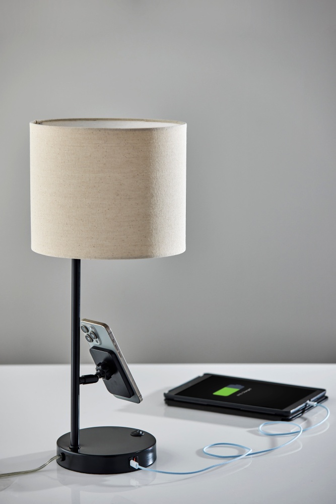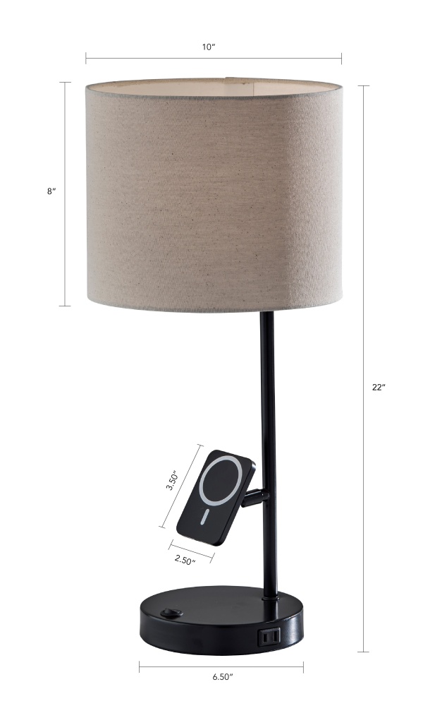 The Wyatt Supercharger Desk Lamp blends classic style with cutting-edge functionality, making it the ultimate desk companion. Featuring a sleek brushed steel finish and a white fabric shade, this 22" lamp adds warmth and sophistication to any workspace. Designed for convenience, the base includes a 2 amp USB-A port, 2 amp USB-C port, and an AC outlet—plus a 10W Qi wireless charging pad mounted on an adjustable magnetic stand for optimal device placement. With an easy-access on/off rocker switch, the Wyatt is as practical as it is stylish.