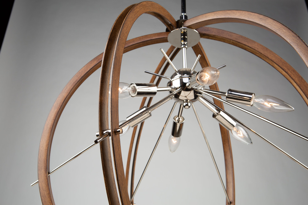 The "Abbey" Collection 6 light pendant features an orb type circular design. The exterior frame is made of metal but has a faux wood finish and is complimented with a plated chrome interior.