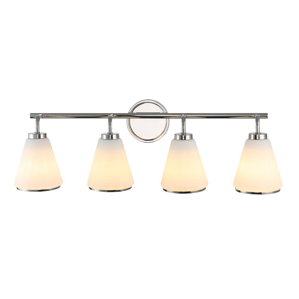 The Zoey Bathroom vanity collection radiates contemporary elegance with its polished nickel frame that gleams with timeless allure. The glossy white glassware softly diffuses light, creating a warm and inviting ambiance ideal for bathrooms. Perfectly blending elegance and functionality, this collection brings a refined touch to any vanity space. (Single, 2 and 3 light models also available)