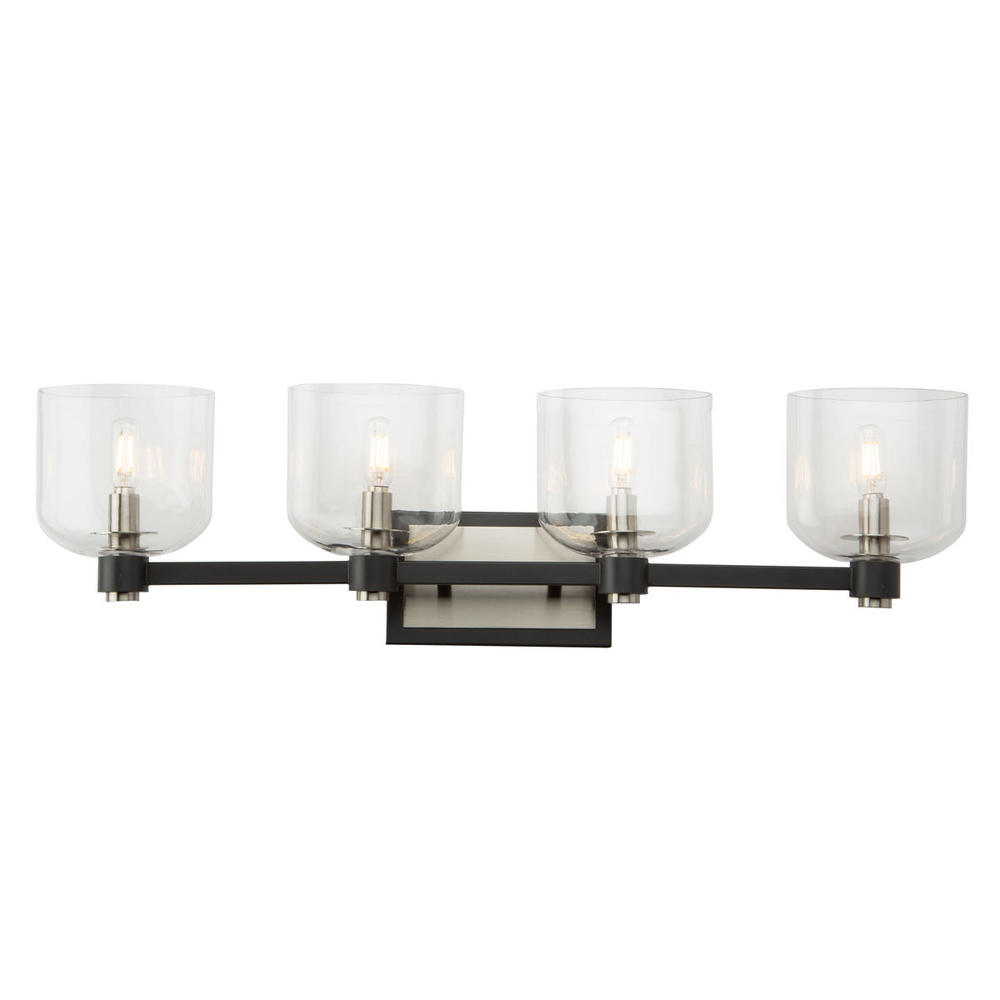 The "Lydon Collection" of bathroom vanities is slick and clean - a perfect compliment to any environment that is modern to transitional. The clear glassware has circular edges. The arms are finished in black while the accents are plated in nickel. Shown as 4 light model but also available in a single or 3 light version.