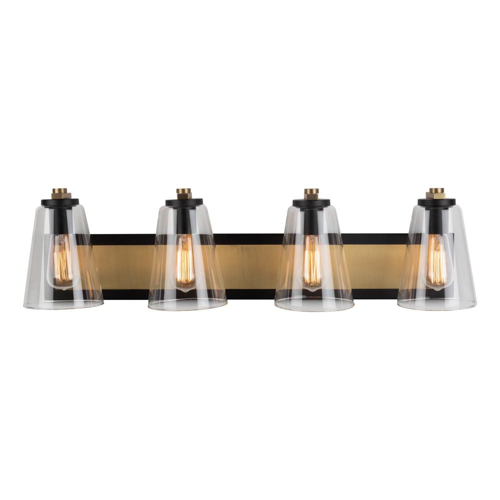 The Treviso collection by designer Kevin Kraemer is a perfect addition to any vanity area. This series features clear cone shaped glassware and is complimented with a black frame and brass accents. It almost appears at the holder has the bulb floating within. Four light version shown but available as a single sconce or 3 light as well.