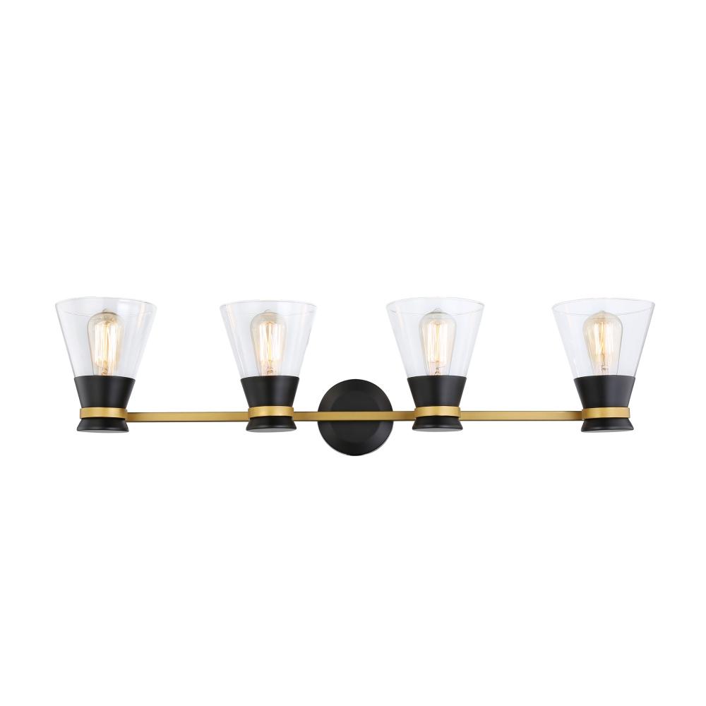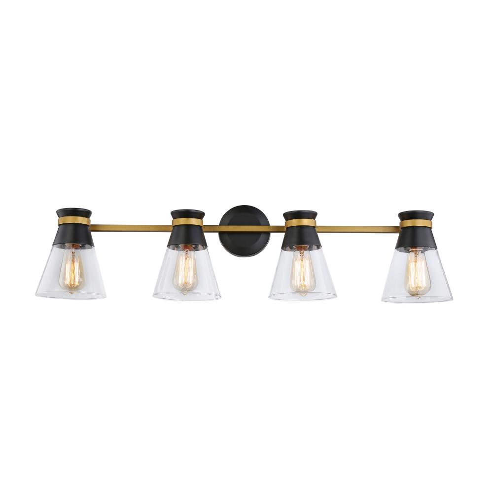 The Kanata collection by designer Kevin Kraemer is unique, stylish and soft. This collection features clear tapered glassware that is held by thin arms that wrap around the cups to finish off the design. The matte black cups are complimented with a smooth brass finish on the arm banding. 4 light version shown - single and three light versions also available. (Alternate colour option available - Polished nickel and black
