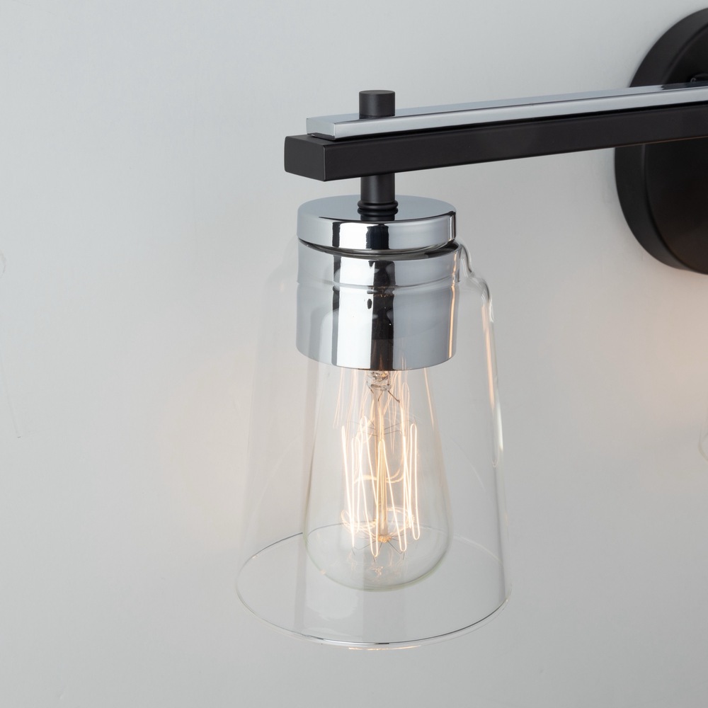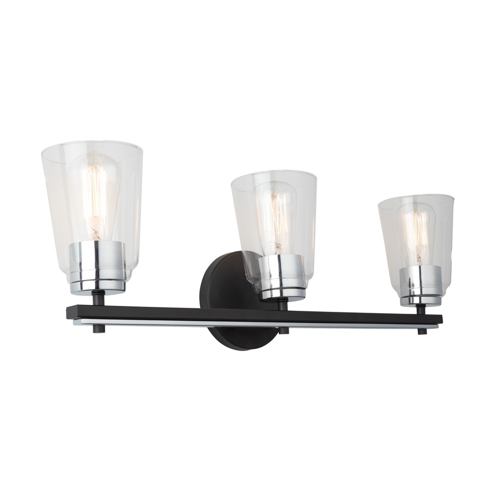 The Essex collection features elegant clear glassware, adding a touch of sophistication to any bathroom decor. Its standout design is characterized by a striking dual-tone finish, combining sleek black and chrome elements seamlessly. This collection effortlessly blends modern aesthetics with functional utility, creating a stylish focal point for your bathroom space. 3 light wall sconce shown. (Also available in a single and 4 light versions.)
