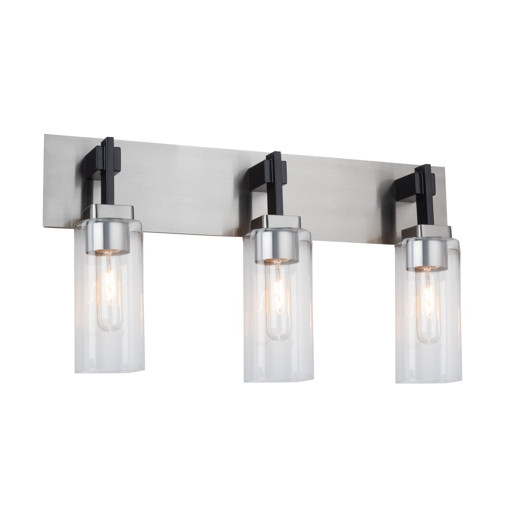 The Arlington collection features clear rectangular glassware that adds a touch of refinement to any bathroom and/or vanity. Its dual-tone black and satin nickel frame provides a modern aesthetic. This collection seamlessly blends style and functionality, making it a stylish choice for those seeking a contemporary and refined bathroom decor. 3 light wall sconce shown. (Also available in a single and 4 light versions.)