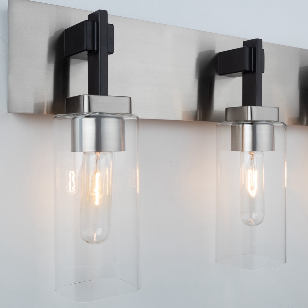 The Arlington collection features clear rectangular glassware that adds a touch of refinement to any bathroom and/or vanity. Its dual-tone black and satin nickel frame provides a modern aesthetic. This collection seamlessly blends style and functionality, making it a stylish choice for those seeking a contemporary and refined bathroom decor. 4 light wall sconce shown. (Also available in a single and 3 light versions.)