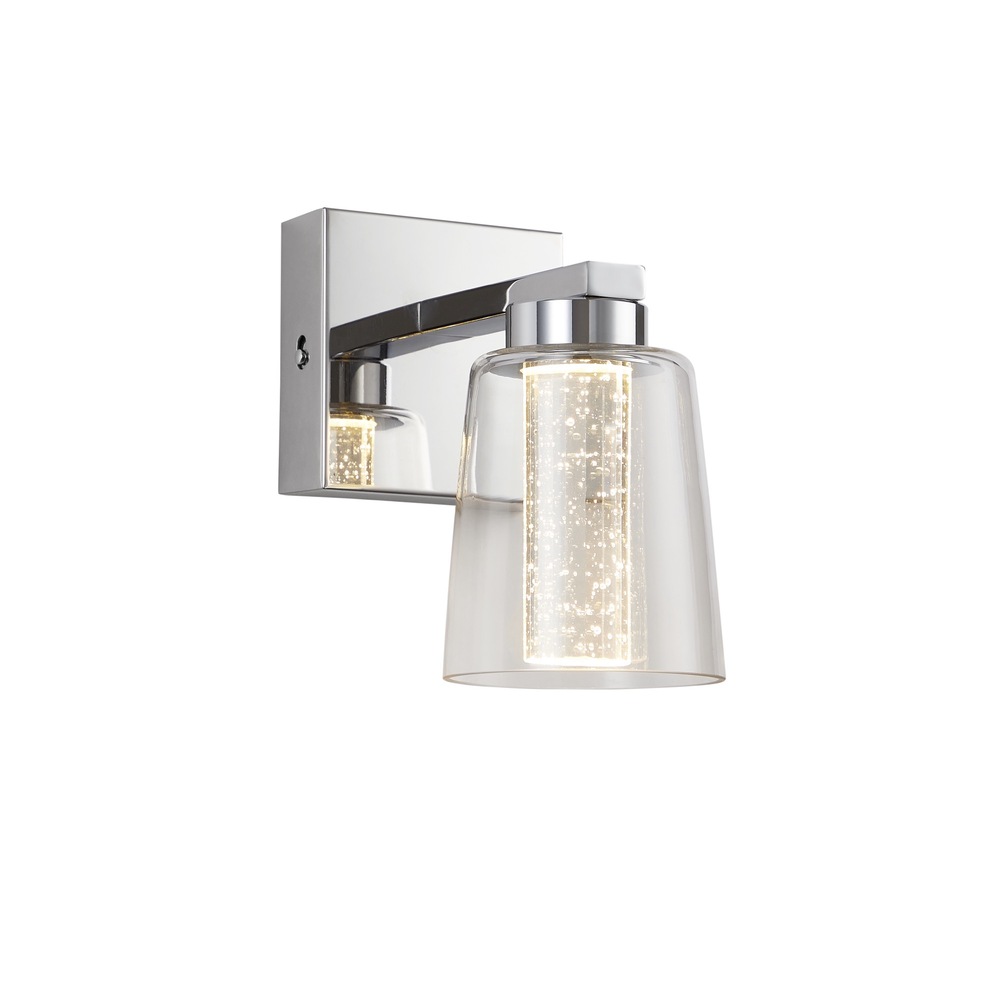 The Dalton Collection features a distinctive design with a clear outer glass surrounding a interior seeded cylinder glass, creating a unique and modern aesthetic. The LED lighting is skillfully integrated to accentuate the seeded glass, providing a visually striking and exceptional effect. Show in with a chrome frame (also available in black). Additionally, these models have a built-in LED switch, allowing users to effortlessly adjust the color temperature from 3000, 4000, and 5000 kelvin for a customizable lighting experience. This collection seamlessly combines functionality with an eye-catching design, making it an elegant choice for any bathroom space. Wall sconce shown. (Also available in a 3 and 4 light versions.)
