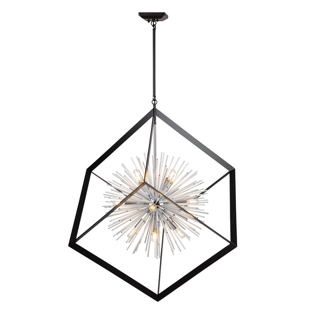 The Sunburst Collection chandelier is unique and a definitely beautiful focal point. The exterior frame is matte black encasing aluminum color thin hollow rods attached to a chrome center. (also available with satin brass interior cluster). 12 light foyer shown