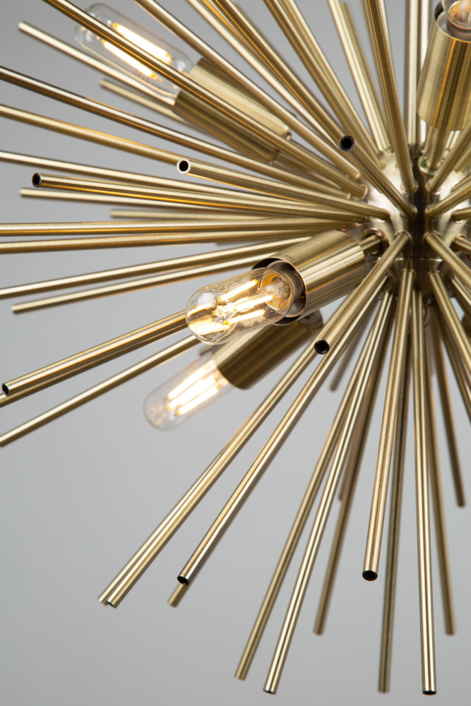The Sunburst Collection 8 light chandelier is unique and a definitely beautiful focal point. Features harvest brass thin hollow rods attached to a chrome center. (also available in aluminum color).