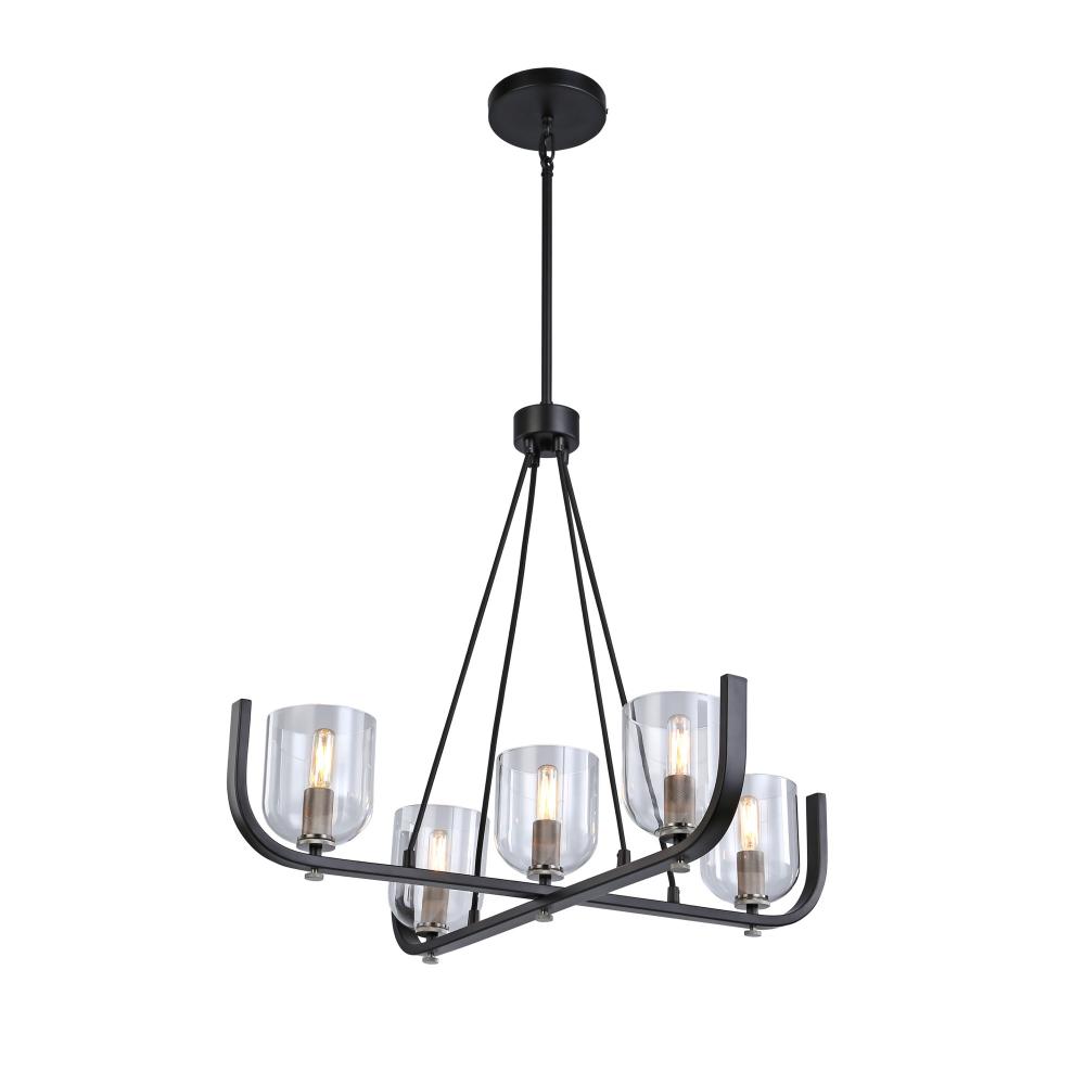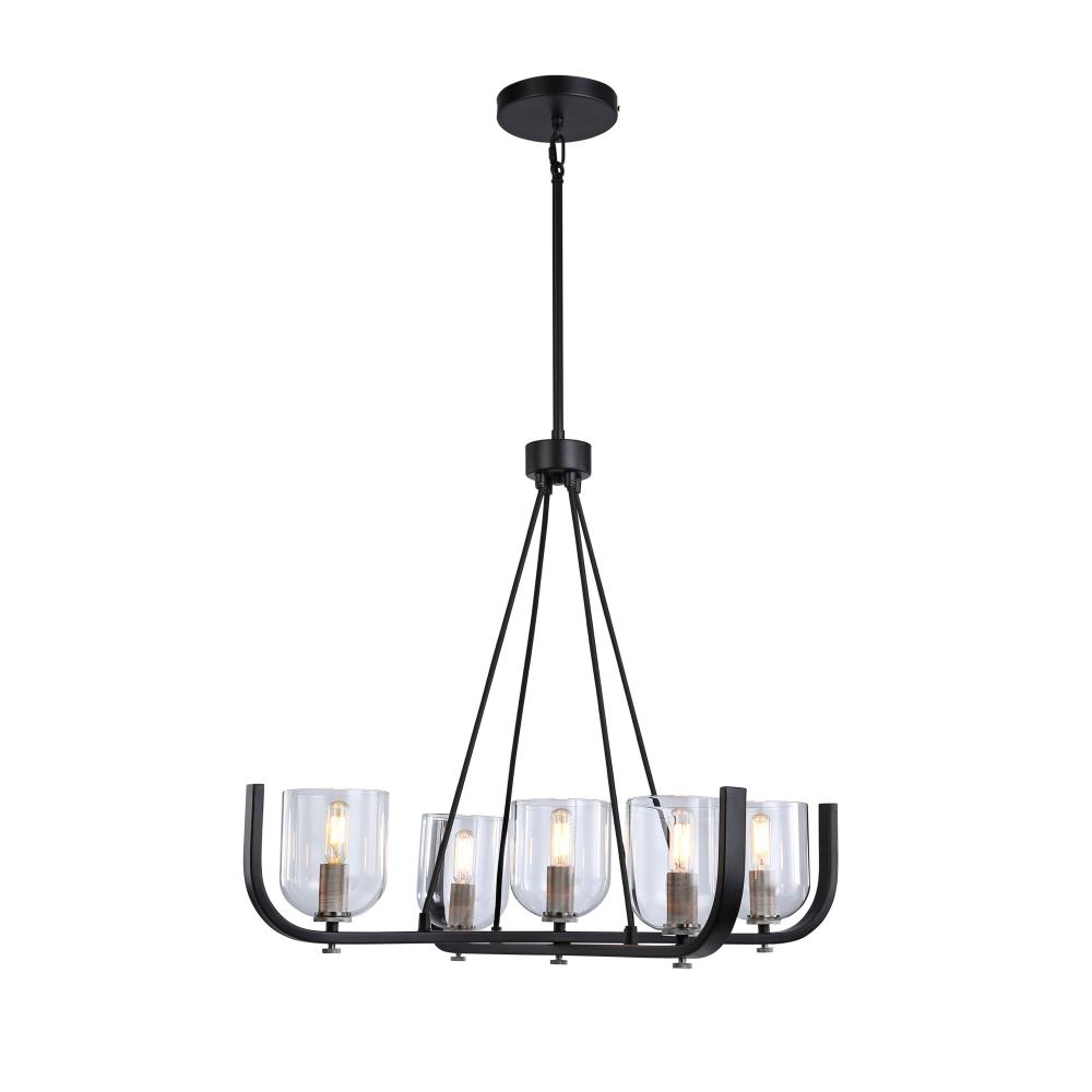 The Cheshire Collection is a spectacular grouping of chandeliers designed by Kevin Kraemer. The frames are black and complemented with nickel. There is fine attention to all the details from the frame shape matching the curves in the glass to the exquisite knural parts on the candle covers and knobs. (Also available in black with brass accents). 5 light chandelier