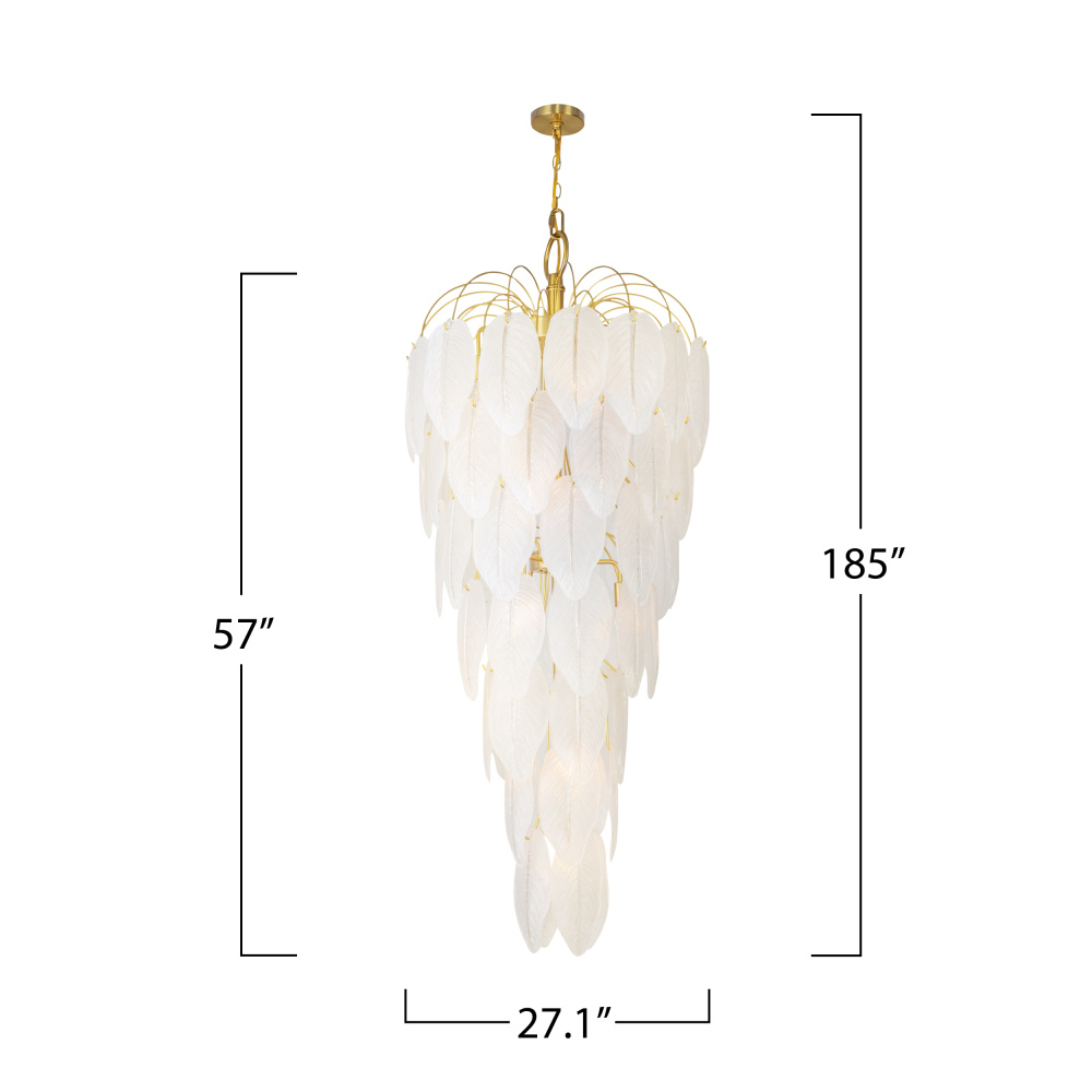 The Alessia collection boasts a captivating design featuring delicate glass leaves suspended from a brilliant airy brass frame. The unique glassware diffuses light casting a mesmerizing and enchanting ambiance in any space. With its harmonious blend of timeless brass elegance and nature-inspired elements, this collection seamlessly combines sophistication and organic beauty, making it a striking centerpiece for any room. The model shown is a 21 light 60.5" body height foyer chandelier (Multiple sizes available) (height adjustable via chain)