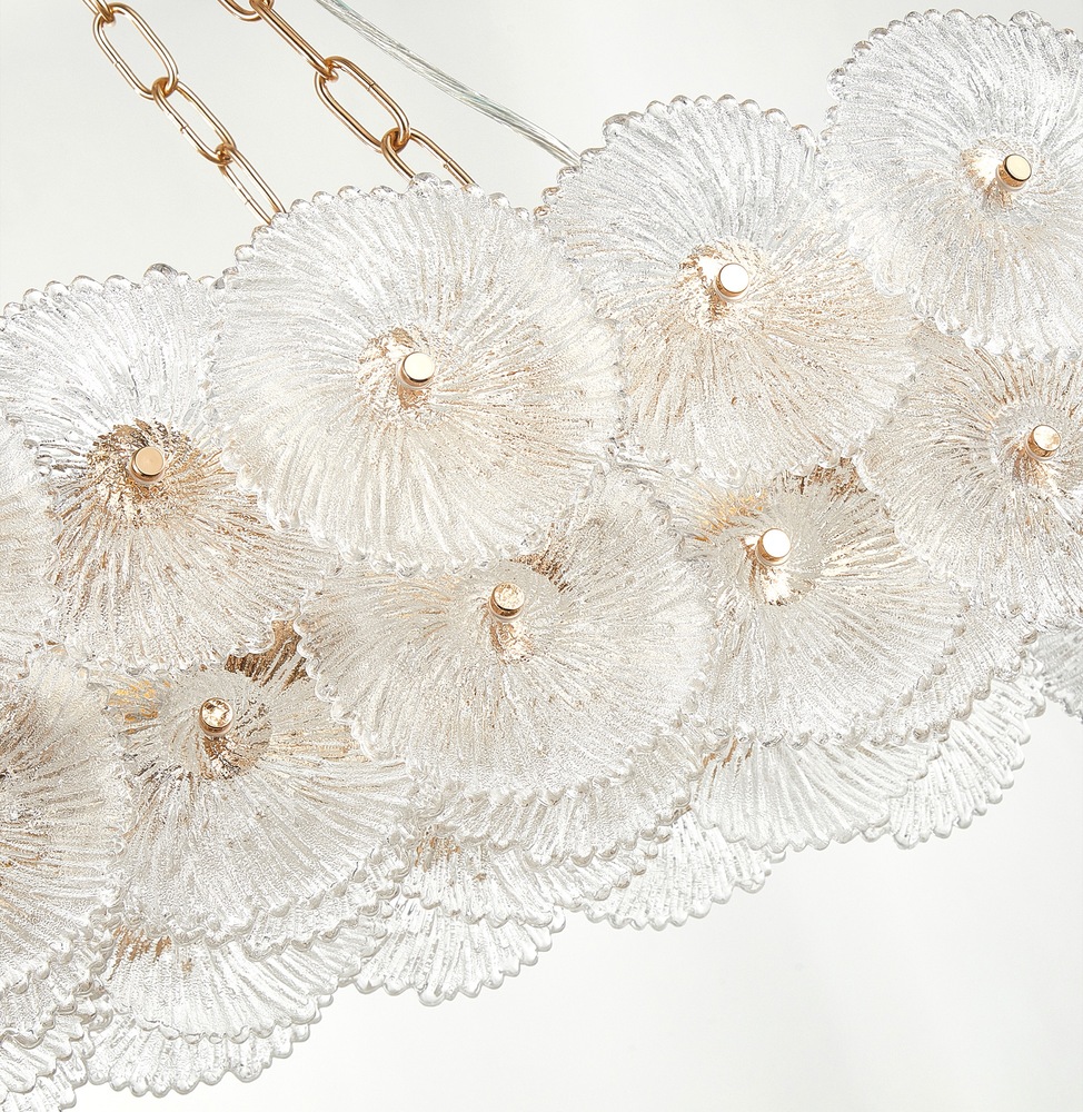 The defining feature of the Bloom collection lies in its enchanting glassware, meticulously crafted to resemble delicate and intricate flowers. The combination of the lustrous brass metal work and the floral-inspired glass elements makes this collection a captivating focal point for any space. The 18 light linear island type chandelier is shown. (height adjustable via chain)