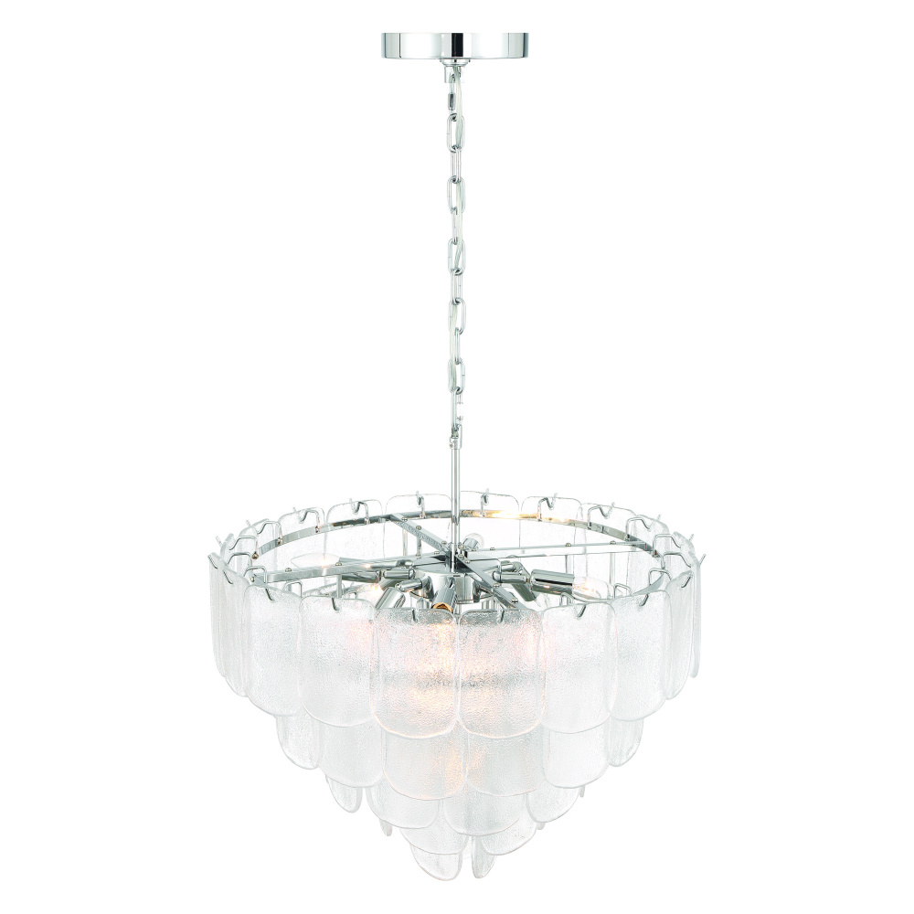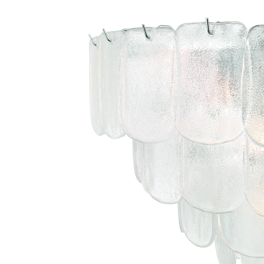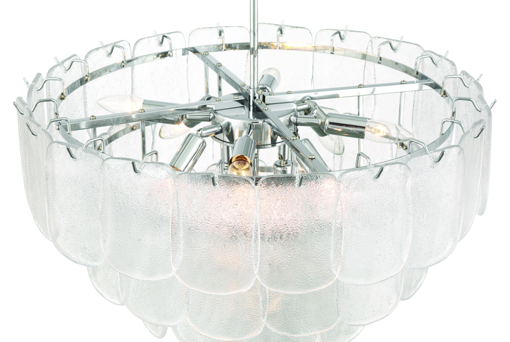 The chandelier from the Bianca collection exudes elegance with its cascading clear “Piastra” glass panels that shimmer like delicate ice sculptures. These textured glass elements are gracefully suspended from a polished nickel frame, radiating a sense of refined artistry and grace. (Medium size version shown)