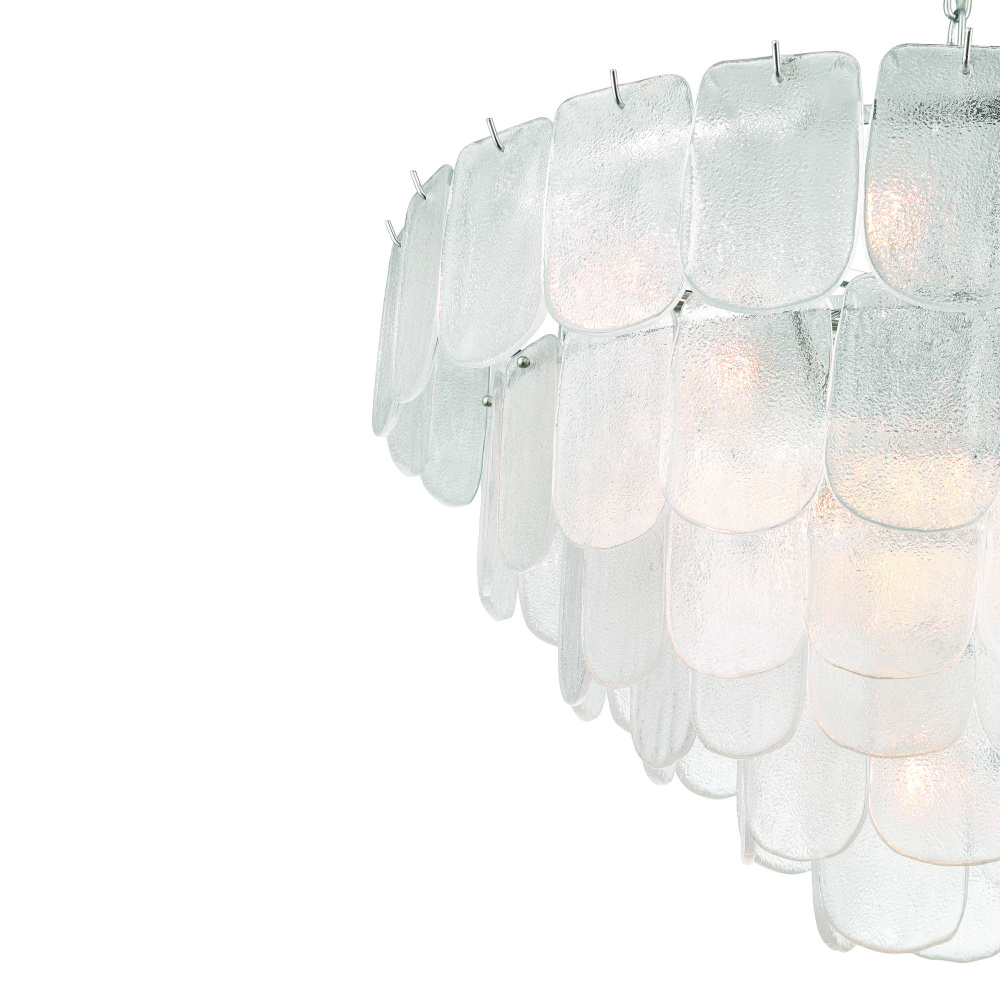 The chandelier from the Bianca collection exudes elegance with its cascading clear “Piastra” glass panels that shimmer like delicate ice sculptures. These textured glass elements are gracefully suspended from a polished nickel frame, radiating a sense of refined artistry and grace. (Large size version shown)