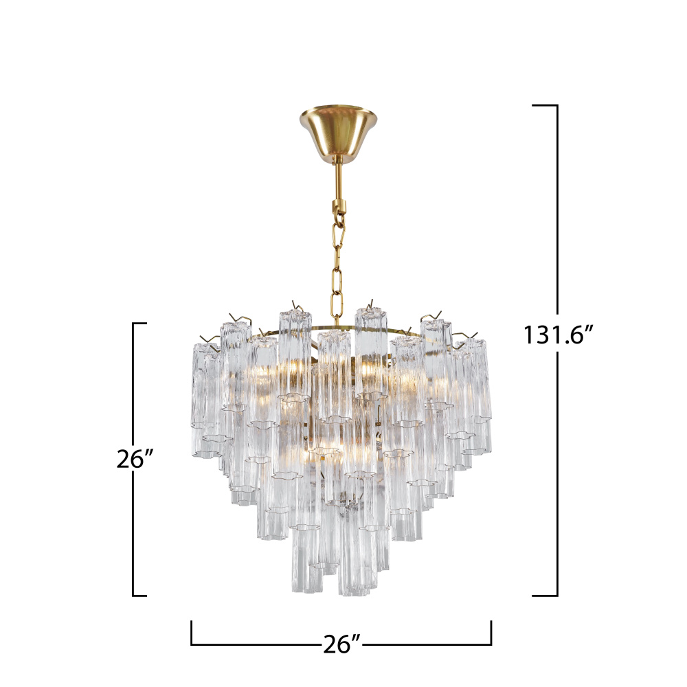 The large chandelier from the Sophia collection captivates with its cascading arrangement of ornate “Tronchi” style clear glassware, reminiscent of shimmering icicles. Each glass element delicately refracts light, creating an enchanting glow, while the warm brass frame provides a refined contrast, evoking a sense of luxury. Perfect for classic and modern interiors alike, this design transforms any space into a haven of timeless beauty.