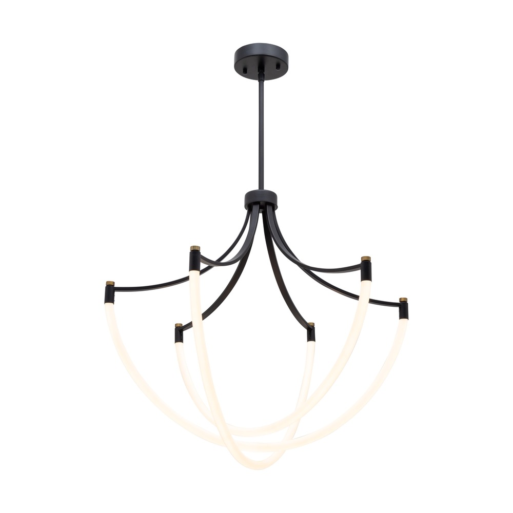The Cascata Collection, designed by Kevin Kraemer, features a sleek and minimalist design, combining precision craftsmanship with modern aesthetics. The frame is black with brass accents. The bright LED illuminated silicone drapes throughout giving this collection an illusion of weightlessness. This eye-catching collection is a perfect complement to any surrounding. The model shown is a height adjustable circular chandelier.