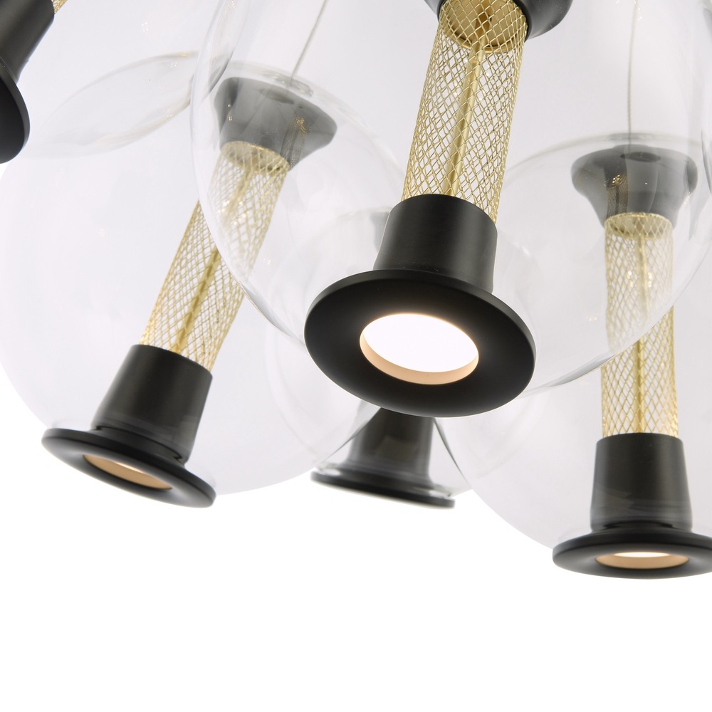 The Arlo collection is a sophisticated lighting ensemble characterized by clusters of transparent glass spheres that showcase an intricate interior mesh design. These spheres are ingeniously illuminated at both the center and bottom using cutting-edge LED technology, creating a captivating and contemporary lighting effect. The combination of modern design and advanced lighting technology in the Arlo collection offers a stylish and visually striking addition to any space. 6 light cluster type chandelier shown - available in a larger 8 light as well. (This model is height adjustable with rods included)