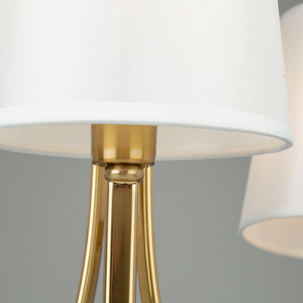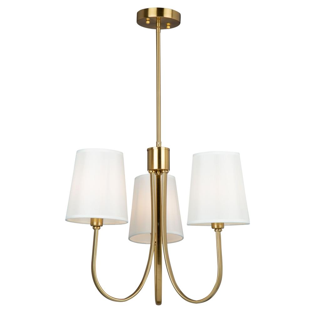 From the S&C design firm, with strict direction from Steven Sabados, the Rhythm Collection chandelier features a traditional type frame with flat tubular arms. The frame is finished in rich plated brushed gold and complimented with linen hardback white shades.