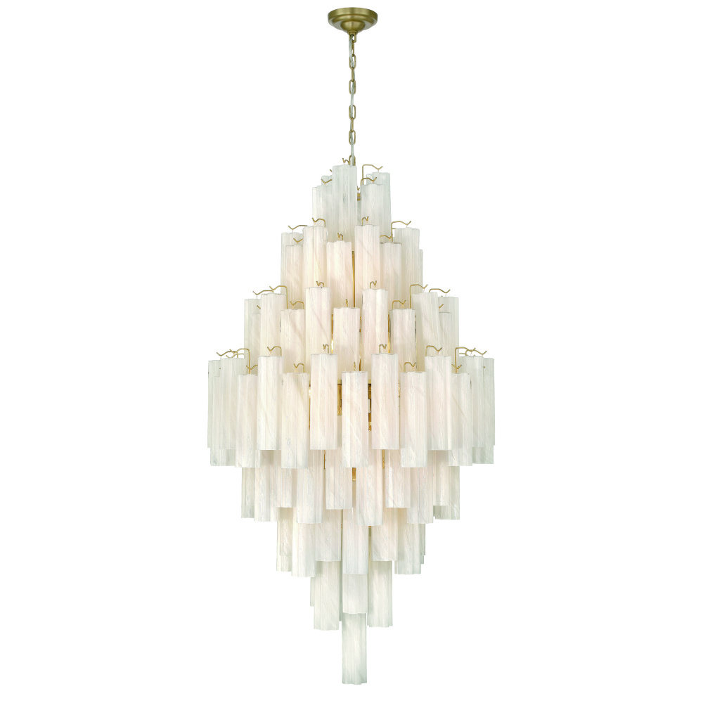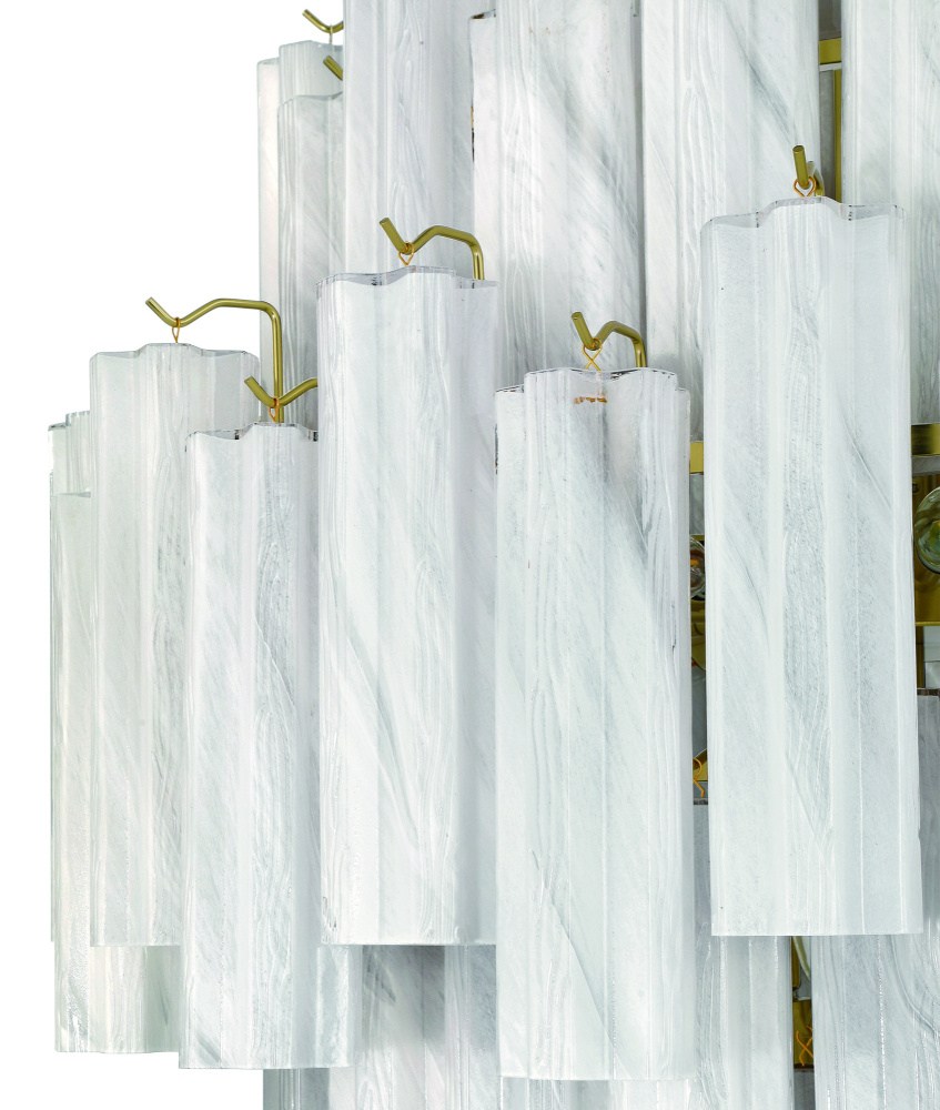The foyer chandelier from the Sophia collection captivates with its cascading arrangement of ornate “Tronchi” style Wispy White glassware, reminiscent of shimmering icicles. Each glass element delicately refracts light, creating an enchanting glow, while the warm brass frame provides a refined contrast, evoking a sense of luxury. Perfect for classic and modern interiors alike, this design transforms any space into a haven of timeless beauty.