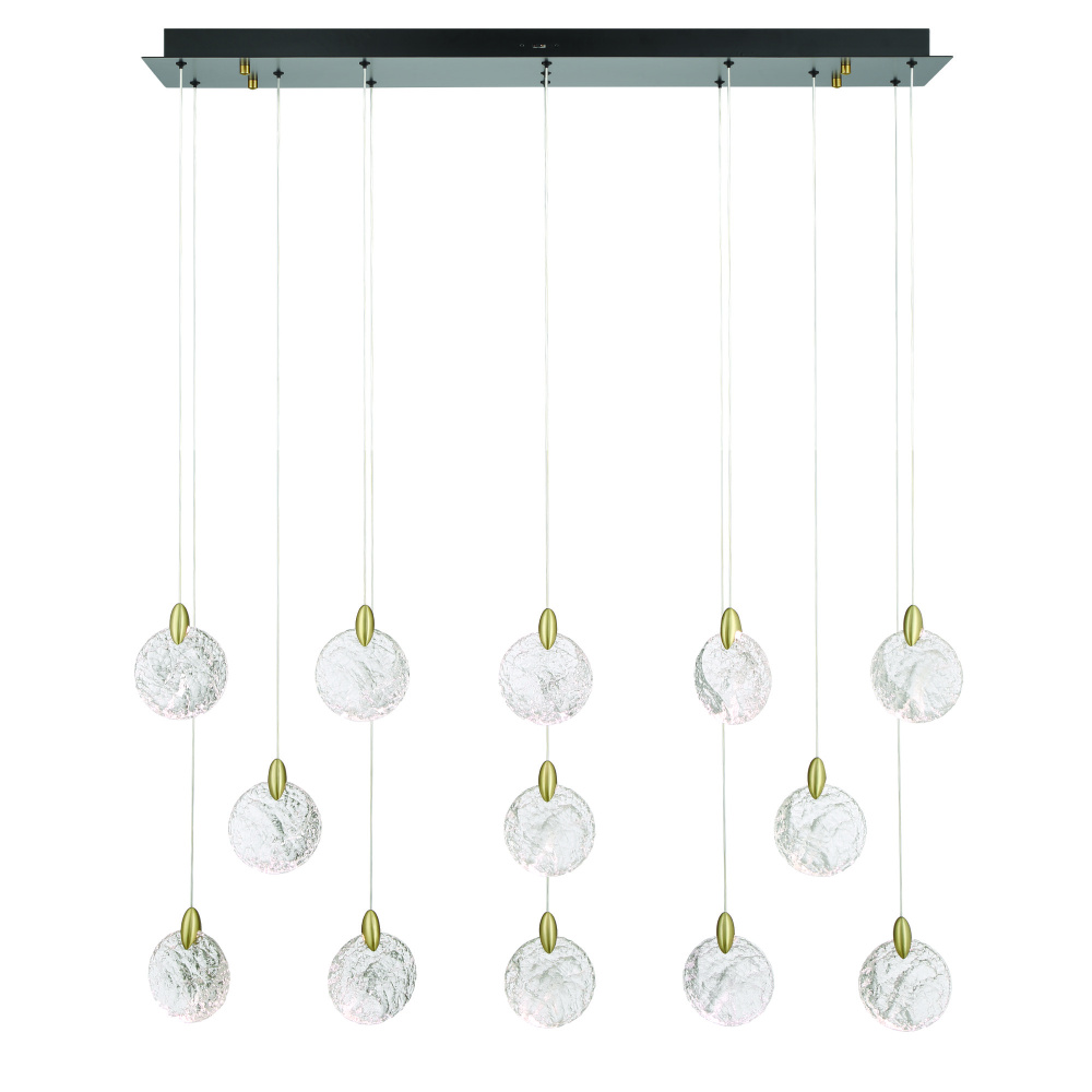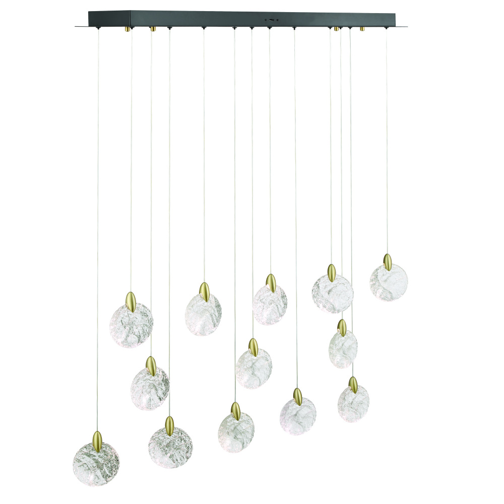 The Snowflake linear chandelier is a masterpiece of elegance, featuring rock-style cut glassware that glistens like frosted crystals, illuminated by energy-efficient LED lighting. Delicate brass holders cradle each glass piece, all suspended from a matte black canopy that adds a dramatic contrast. Its thoughtful design includes a 3CCT switch, allowing you to choose between warm, neutral, or cool color temperatures (3K, 4K, 6K), and the dimmable functionality lets you tailor the ambiance to perfection. The easily adjustable wires ensure a seamless fit for any ceiling height, making this chandelier as versatile as it is enchanting.