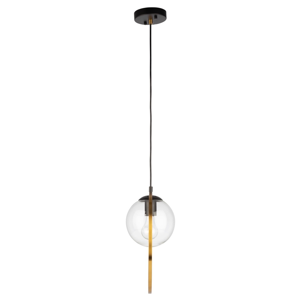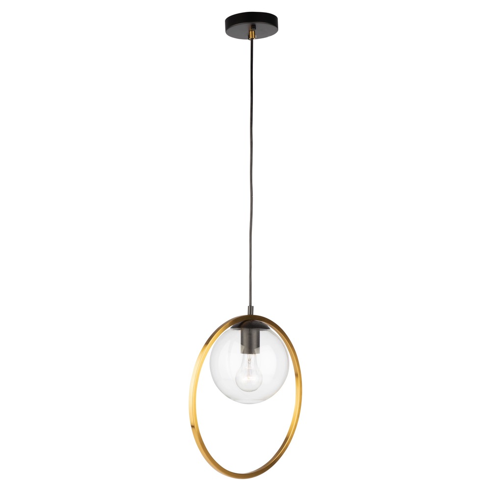 From the Lighting Pulse design firm, this Lugano collection single pendant features clear round glassware which is complimented by a vintage brass encasing on a black frame.