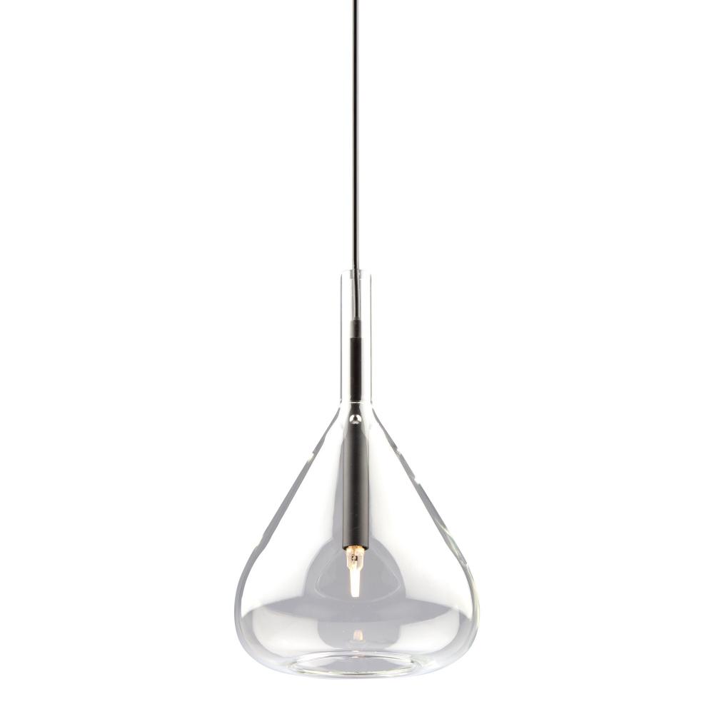 The Conic collection features a uniquely shaped glass design suspended on black frames. The glass is suspended by 3 nickel bullets to give it a floating effect. The bottom of the glass is open for each access to the bulbs. To finish off the design, the wiring has black textile covering.