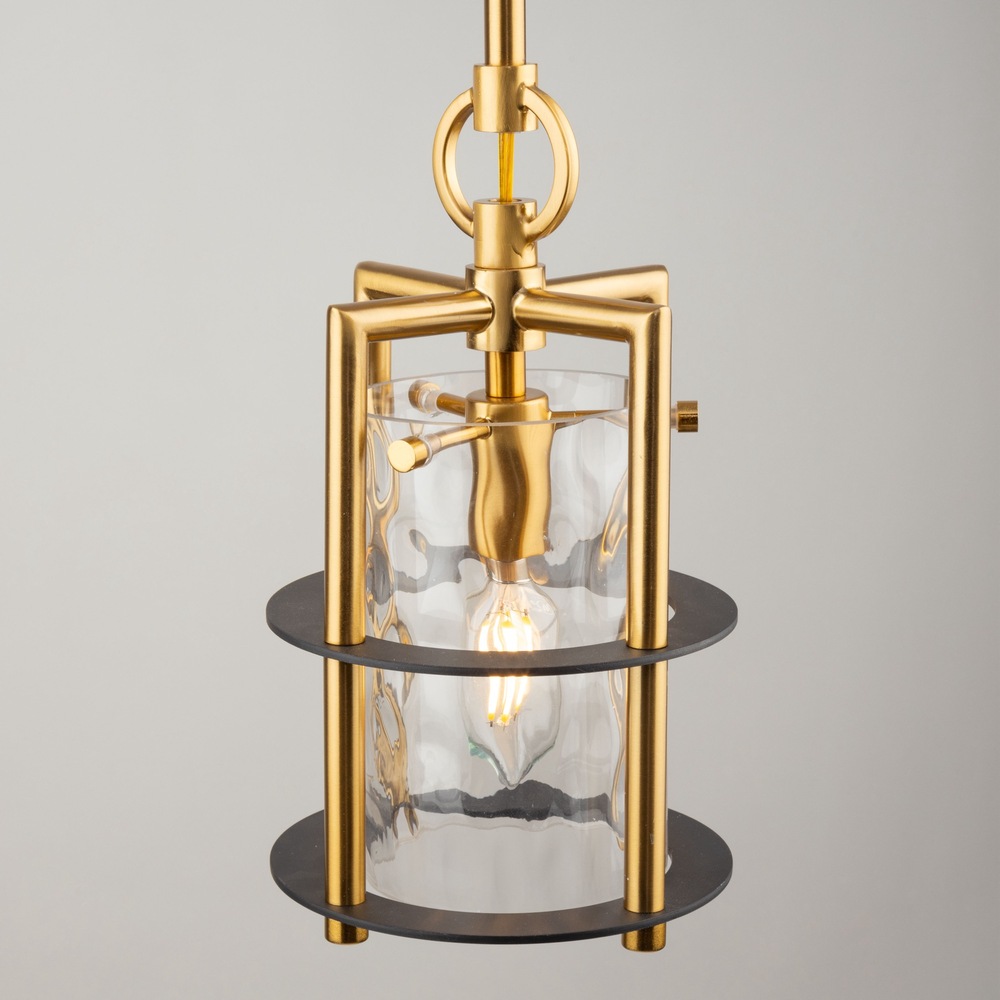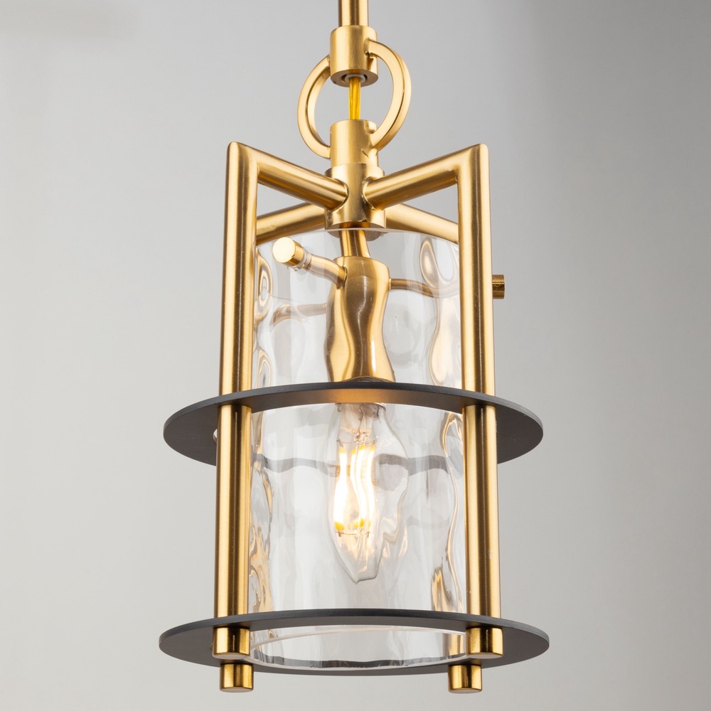 The Buford Collection is a striking ensemble that seamlessly blends elegance and modern design. Its defining features include a brass frame complimented with black rings, creating a contemporary contrast against the timeless appeal of the metal. The thick semi-transparent water glass add opulence and warmth, making these lanterns style chandeliers a sophisticated focal point for any space. Single light pendant shown (height adjustable with rods and built in hangstraight for sloped ceilings).