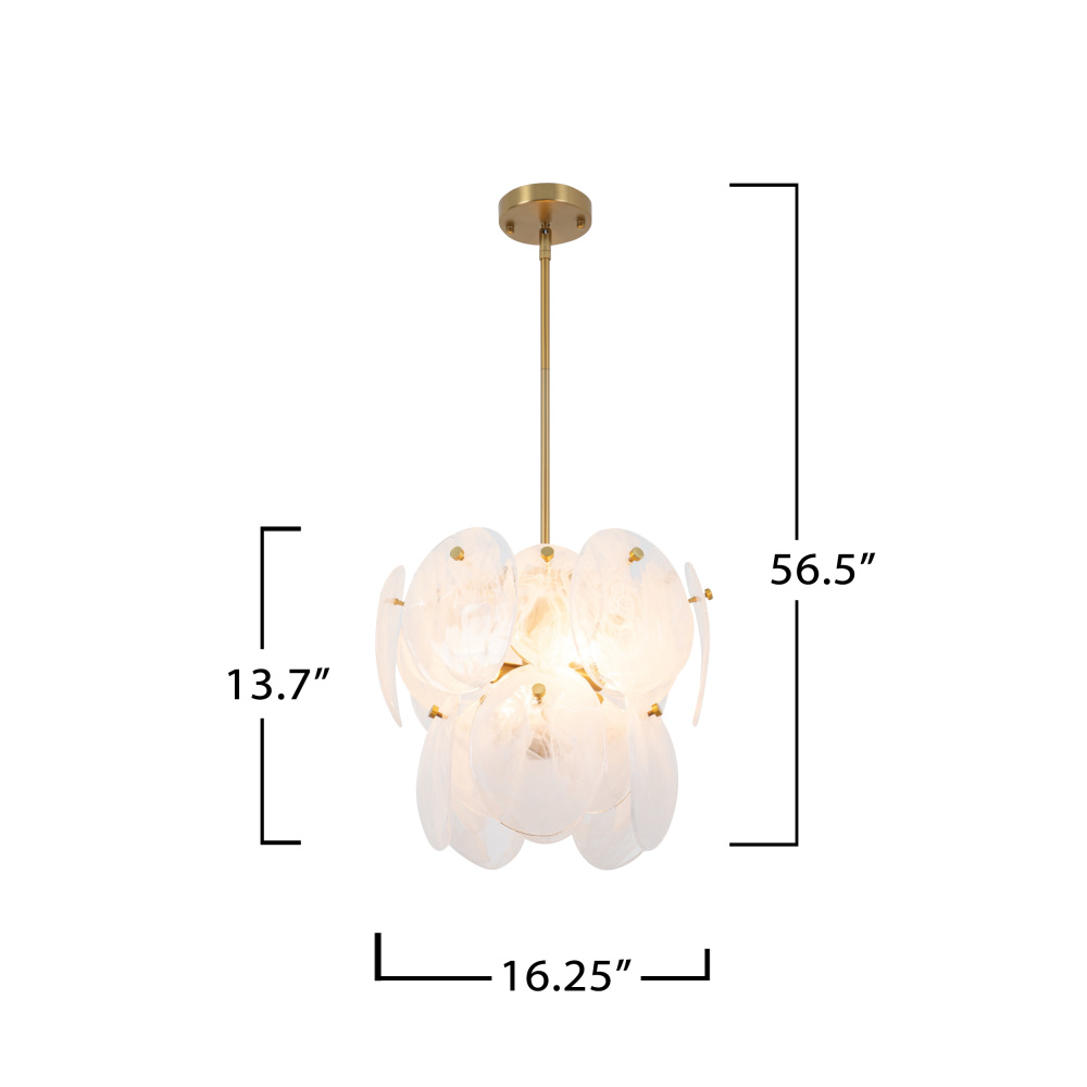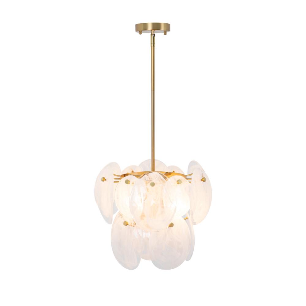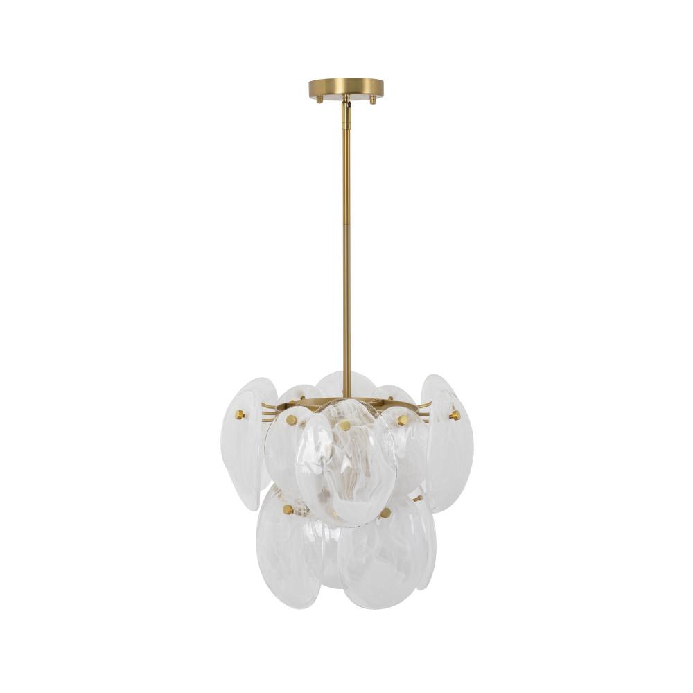The Lily Collection exudes a delicate charm, captivating with its Murano-style glasswork in a wispy white finish. Each circular panel dances with subtle elegance, reflecting light in a manner that feels both luxurious and inviting. Complemented by a brushed brass frame, the design radiates a poetic blend of elegance and allure. This chandelier casts a spell of enchantment, illuminating your space with a touch of dreamy opulence.