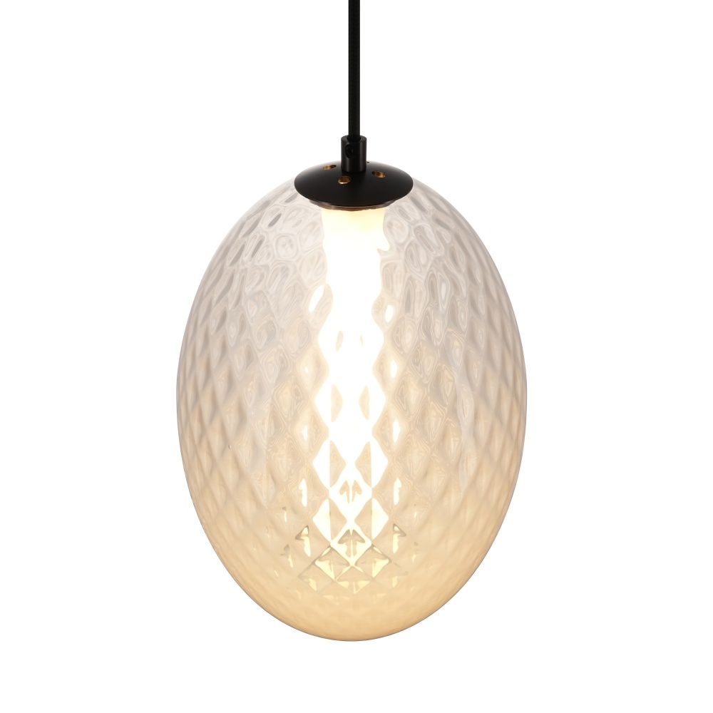 The LED pendant from the Celeste collection is a symphony of sophistication, featuring a mesmerizing diamond-patterned ombre white glass that gracefully encases an illuminated inner white tube. Its gunmetal-finished metalwork adds a rich, modern allure, making it a standout centerpiece for any room. A clever peek-hole design at the bottom casts a focused beam of light downward, while the ambient glow from the sides creates a warm and inviting atmosphere. This elegant fixture is a harmonious blend of form and function, perfect for elevating your space with timeless charm. The textile wire cover is designed for elegance and ease height adjustment.