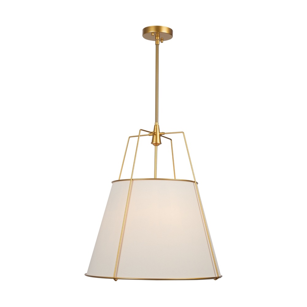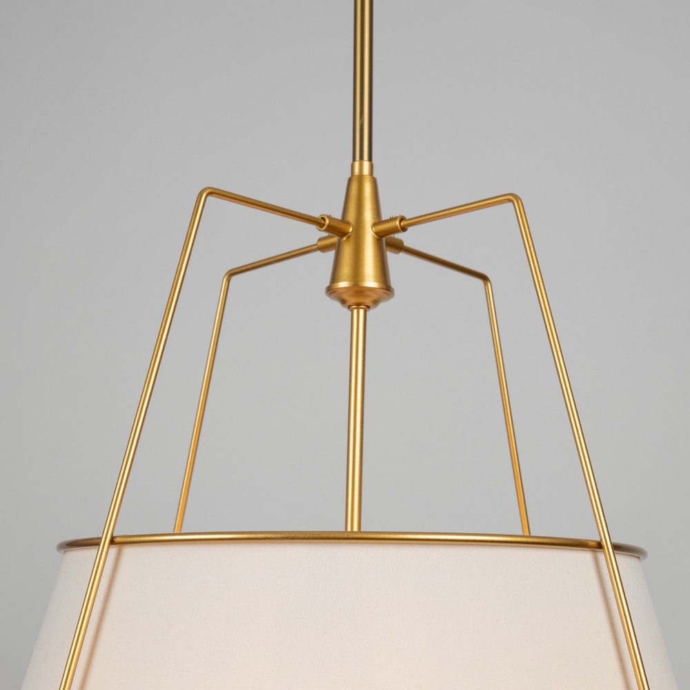 Designed by Steven Sabados (S&C), the Pullman Collection of linen shades is elegantly suspended by brass metal frames, seamlessly combining classic and modern design elements. The high-quality linen shades, gently tapered and expertly crafted, diffuse light to create a warm and inviting ambiance. With their timeless elegance and versatile aesthetics, these shades add a touch of sophistication to any space they grace. The model shown is a 4 lite 21" diameter pendant chandelier. (also available with black metalwork)