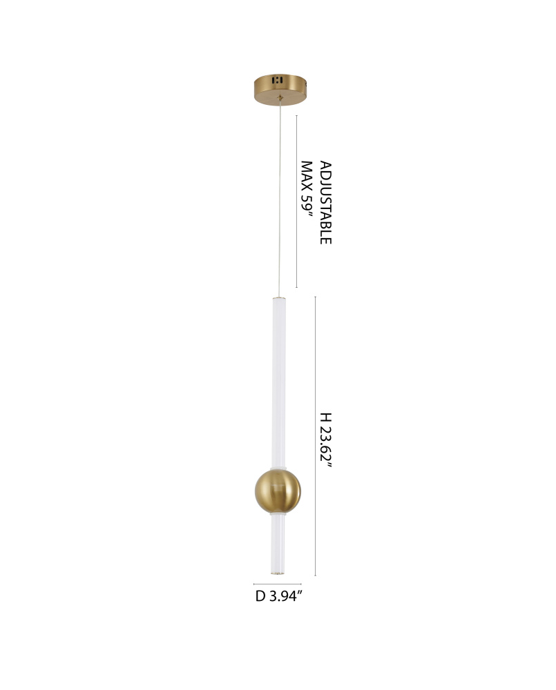 This transitional LED pendant is a stylish and energy-efficient lighting solution. With a height of 23.62 inches and a diameter of 3.94 inches, this pendant light is designed to provide ample lighting for a variety of spaces such as bedroom, hallway, kitchens, or living rooms. The gold frame and white glass shade give it a sleek and modern aesthetic that will complement any décor. With a color temperature of 3000K, the light has a warm and cozy tone that is perfect for creating a relaxing atmosphere. The adjustable cord link makes this fixture suitable for most ceiling heights.