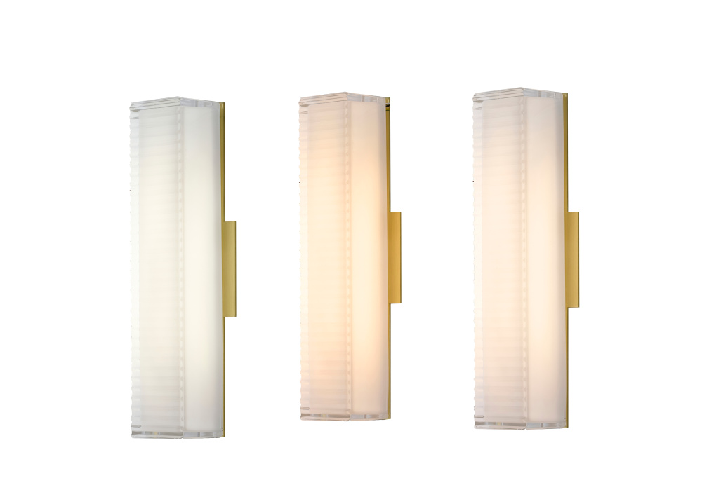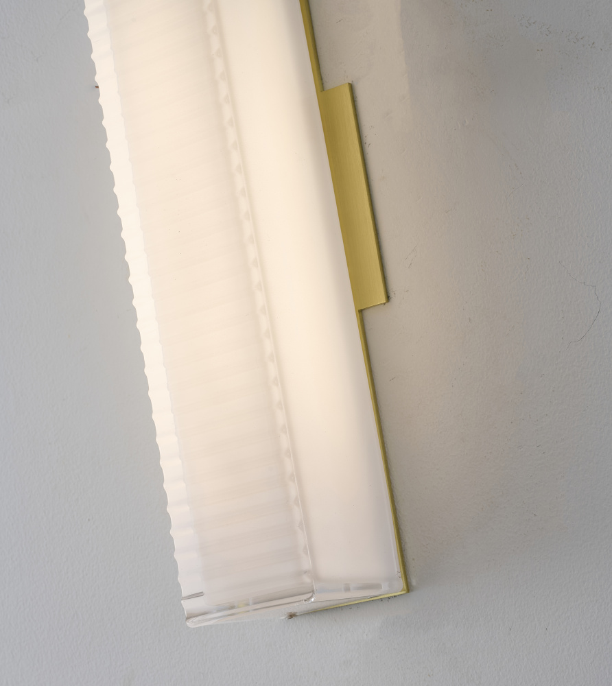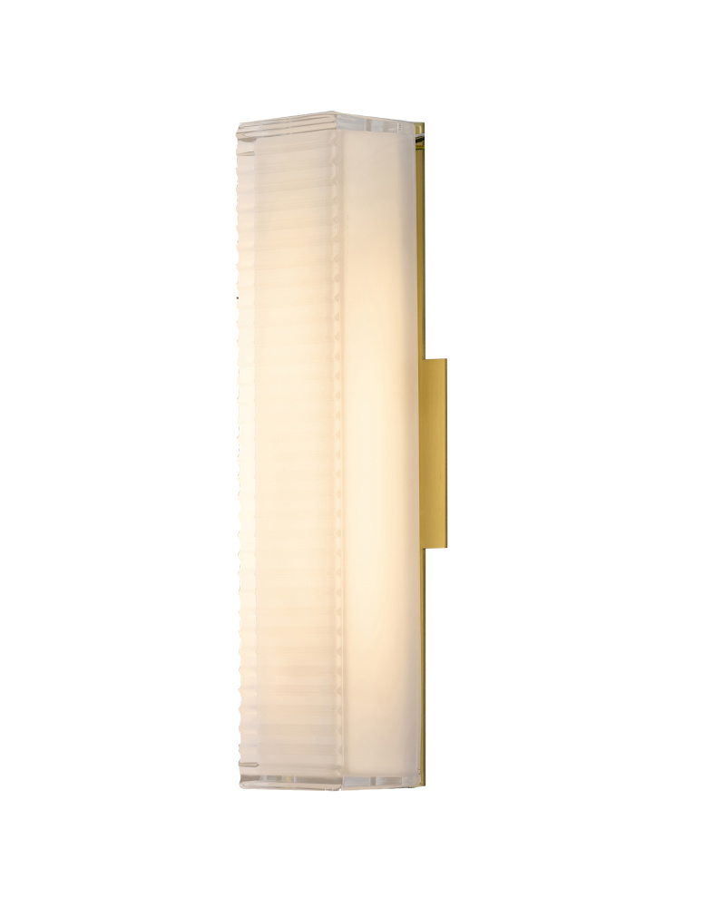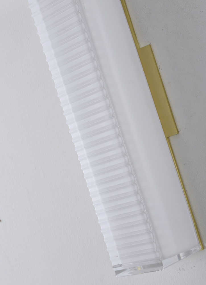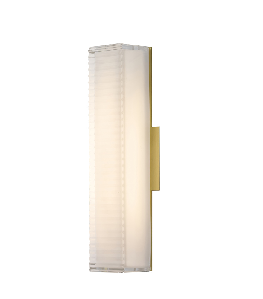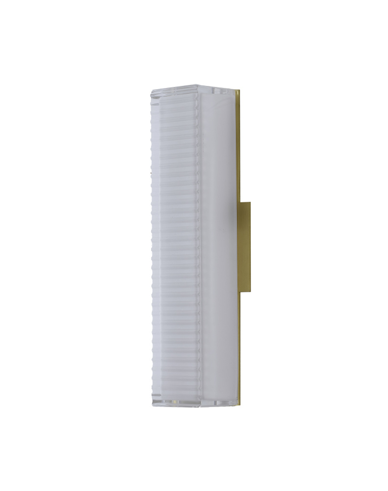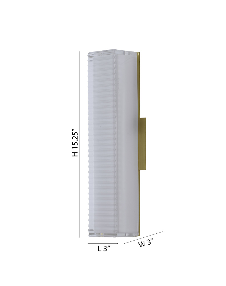 This LED wall sconce is a transitional and sleek lighting fixture that adds a touch of sophistication and elegance to any room. The matte brass metal frame provides a clean and minimalist look, while the clear frosted flute glass shade adds a touch of simplicity and refinement. The lamp's dimensions of 3 inches wide, 3 inches deep, and 15.25 inches high make it a great option for bedroom, living room, hallway, or bathroom. The 8W LED rating means it is energy-efficient and provides a bright and warm glow.