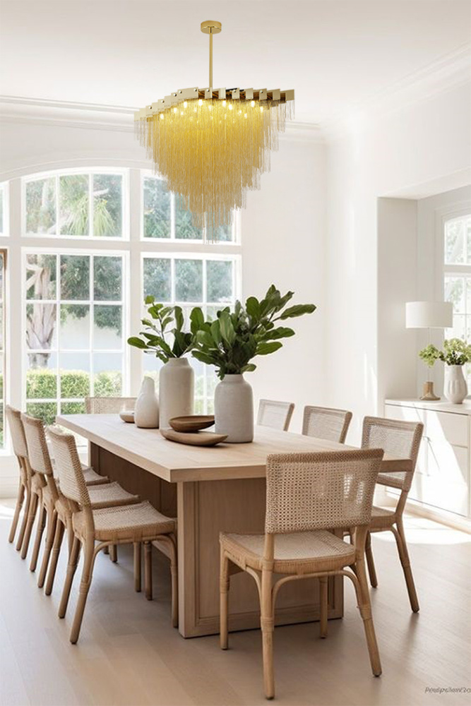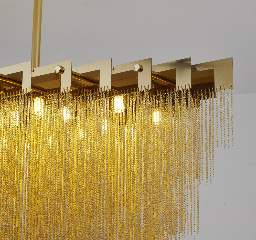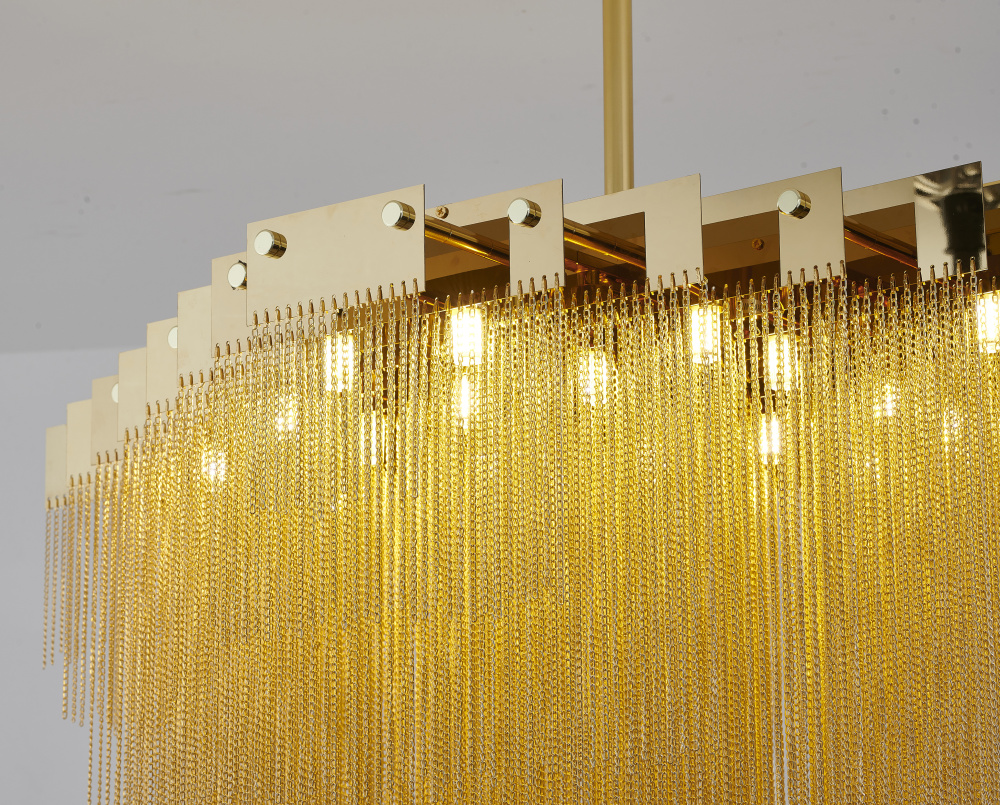 This chandelier is a unique and transitional lighting fixture that adds a touch of industrial chic to any room. The gold stainless steel chain design provides a sleek and modern look, while the lamp's dimensions of 39.4 inches long, 23.6 inches wide, and 31.5 inches high make it a great option for living room, dinning room, or foyer. The 20xG9 base is compatible with standard light bulbs (Bulbs Not Included), and the 40W rating means it can provide a bright and warm glow.