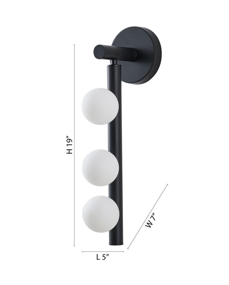 This transitional wall sconce is a sleek and modern lighting fixture that adds a touch of sophistication to any room. The matte black frame provides a sleek and understated base for the white glass shade, which allows the light to shine through and create a warm and inviting glow. The overall dimensions of the fixture are 5 inches in length, 7 inches in diameter, and 19 inches in height, making it a compact and versatile option for use in a variety of spaces such as living room, bedroom, or hallway. The 3xG9 sockets (Bulbs Not Included) provide ample lighting, each with a 40-watt capacity.