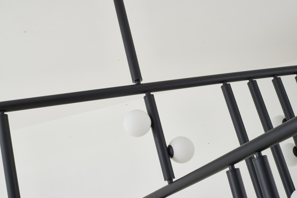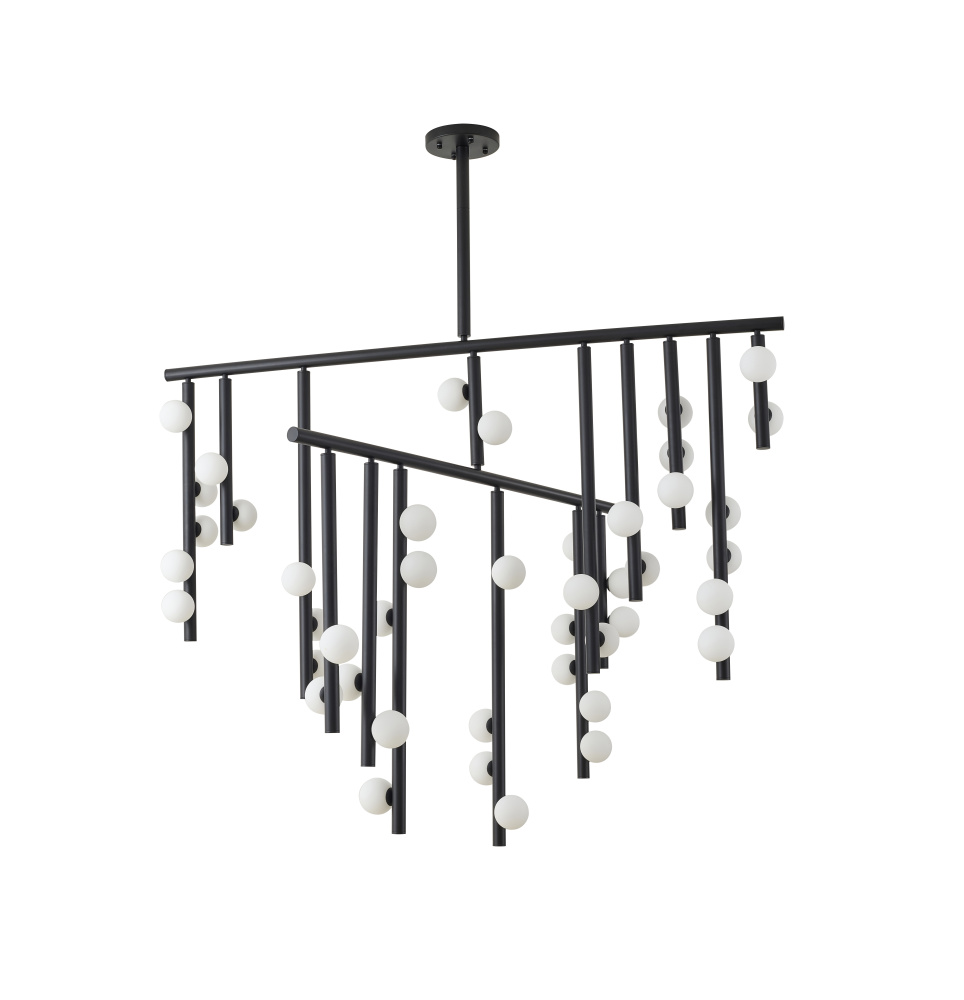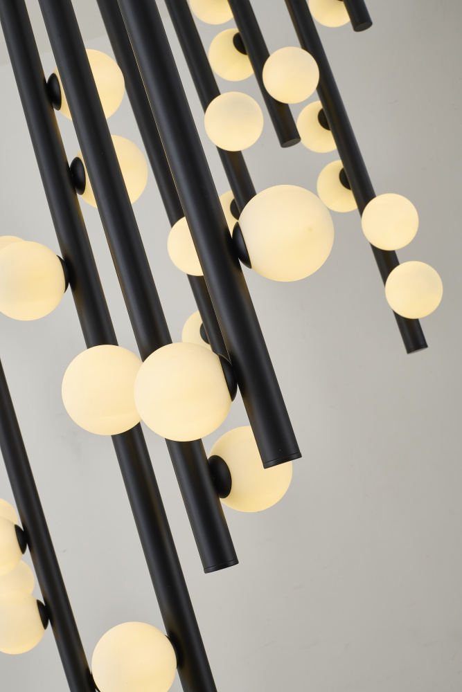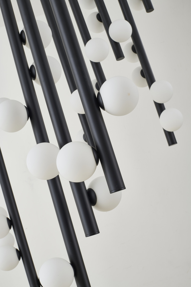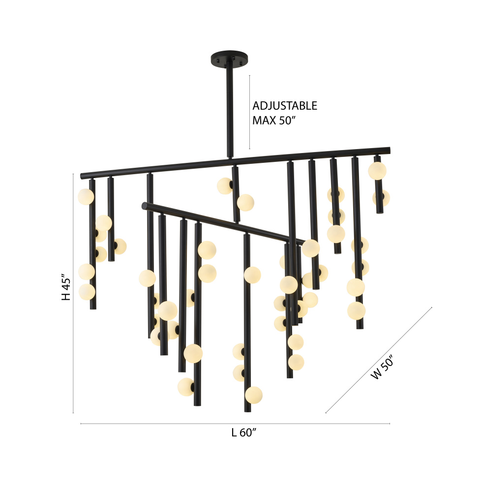 This contemporary chandelier is a stunning and dramatic lighting fixture that makes a statement in any room. The matte black frame provides a sleek and modern base for the white glass ball shades, which add a touch of elegance and sophistication. The overall dimensions of the fixture is L60"W50"H45". The 44xG9 sockets (Bulbs Not Included) provide ample lighting, each with a 40-watt capacity. This makes it suitable for use in large commercial or residential spaces, such as living room, dinning room, or foyer. The adjustable rod link makes this fixture suitable for most ceiling heights