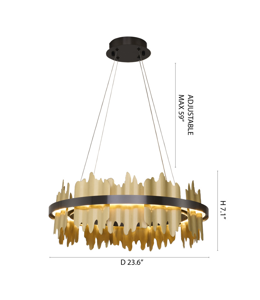 This transitional LED chandelier boasts a stylish and modern design, featuring a brass wave light trim that adds a touch of sophistication. This LED tri-color light fixture measures 23.6 inches in diameter and 7.1 inches in height, making it a great option for adding ambiance to spaces such as bedroom, living room, dinning room, or foyer. With a 40W power rating, it provides sufficient lighting while being energy-efficient. The tri-color feature allows for adjustable color temperature and brightness, making it easy to customize the mood to suit your needs.