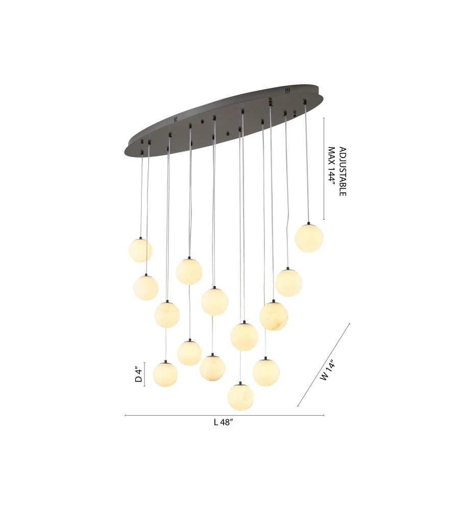 This chandelier is a sleek and transitional lighting fixture that combines the warmth of alabaster with the durability of stainless steel frame. The lamp features white alabaster shades that provide a soft, diffused light, while the black stainless steel frame adds a touch of industrial chic to the design. With a overall height of 144 inches, length of 48 inches, and width of 14 inches, this pendant lamp is perfect for hanging above a living room, dinning room, or foyer.