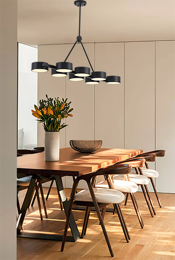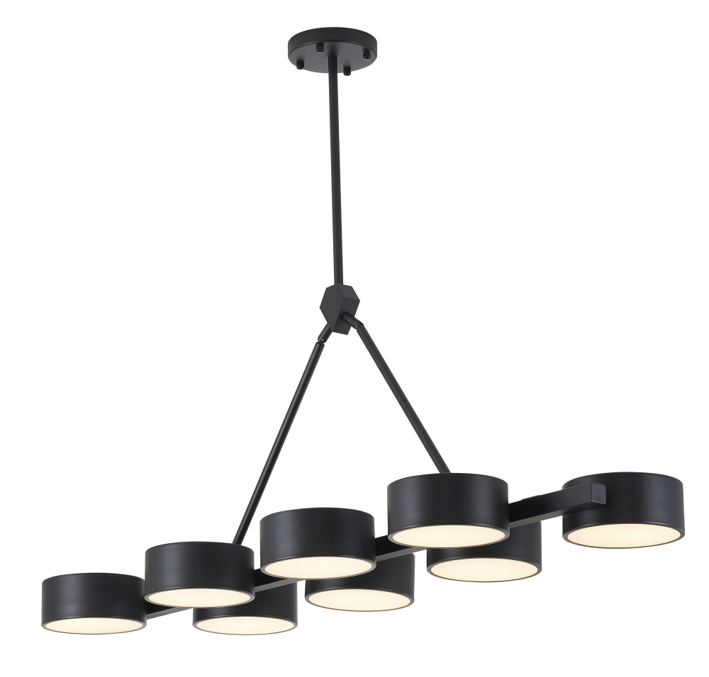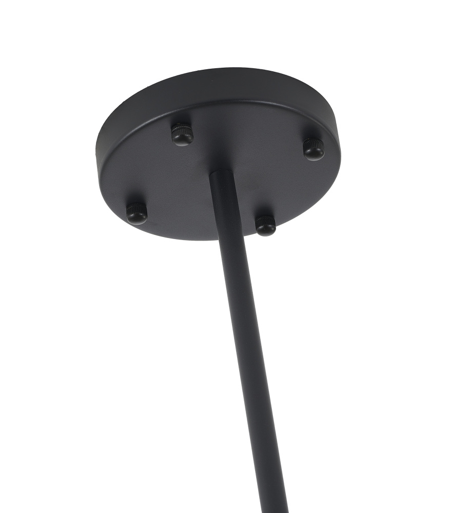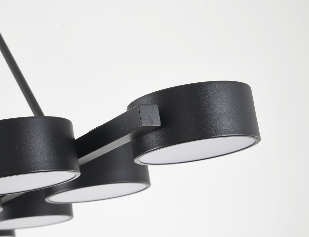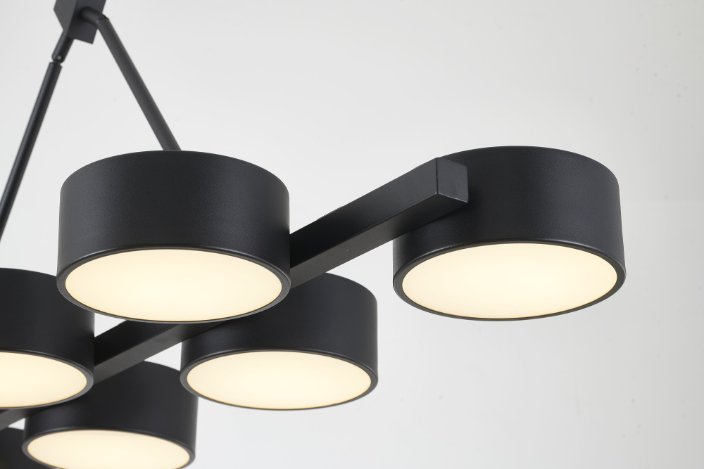 This LED chandelier is a black frame chandelier. It comes with round accent shades and white acrylic diffusers. The rod length of 6" + 12" + 16" + 16" is provided and the rod length is adjustable. The LED color temperature for this LED chandelier is 3000K.