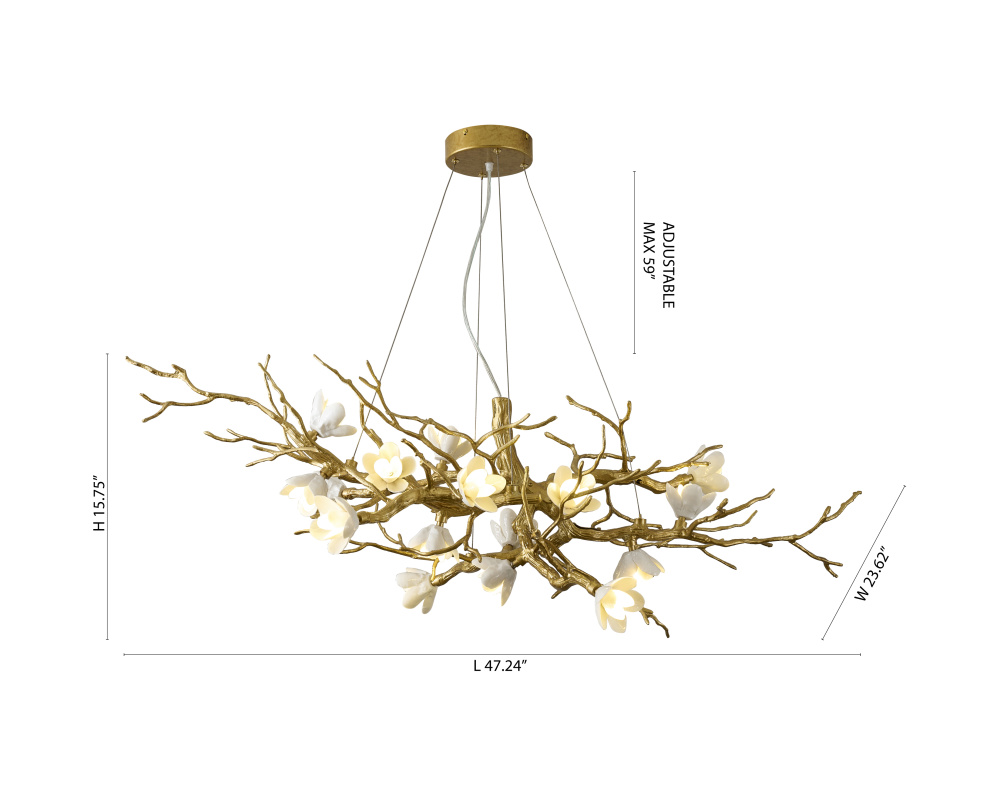 This transitional chandelier is a stunning lighting fixture that features a sleek brass metal frame and 16 white ceramic shades. Measuring 47.24 inches in length, 23.62 inches in width, and 15.75 inches in height, this fixture is sure to make a statement in any room. The white ceramic shades add a touch of elegance and sophistication, while the brass frame provides a warm and inviting glow. This chandelier is designed to provide 16xG4 sockets, and 80W for each bulb (Bulbs Not Included). Whether you're looking to add some ambiance to a dinning room, living room, or foyer, this chandelier is the perfect choice.