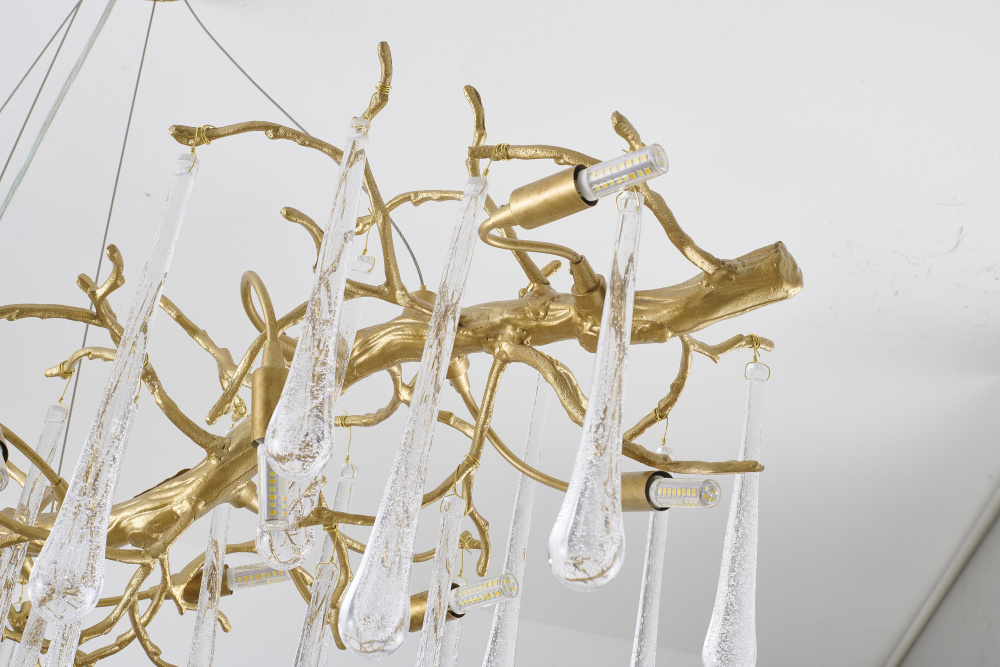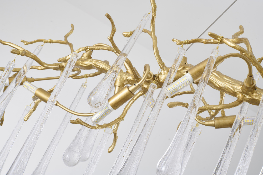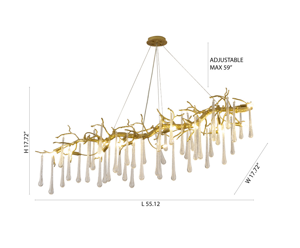 This chandelier is a sleek and transitional lighting fixture that features a unique combination of materials and design elements. The brass aluminum frame provides a sturdy and durable base, while the clear glass drop accents add a touch of elegance and sophistication. Measuring 55.12 inches in length, 17.72 inches in width, and 17.72 inches in height, this fixture is sure to make a statement in any room. This chandelier is designed to provide 14xG4 sockets, and 70W for each bulb (Bulbs Not Included). The clear glass drop shades allow for a warm and cozy glow, making this fixture perfect for living room, dinning room, or foyer.