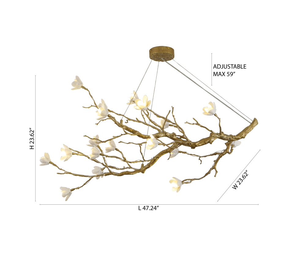 This transitional chandelier is a stunning and elegant lighting fixture that adds a touch of luxury to any room. The brass copper frame provides a warm and rich base, while the white ceramic shades add a touch of sophistication and refinement. Measuring 47.24 inches in length, 23.62 inches in width, and 23.62 inches in height, this chandelier is designed to make a statement in any room. This chandelier is designed to provide 18xG4 sockets, and 90W for each bulb (Bulbs Not Included). The white ceramic shades provide a soft and warm glow, making this fixture perfect for dinning room, living room, or foyer.