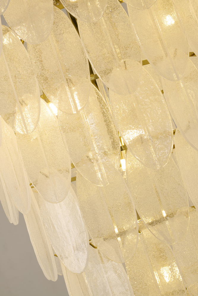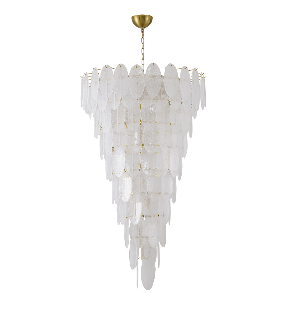 This chandelier is a brass chandelier. It comes with frosted glass shades. The chain length of 108 inches is provided and the chain length is adjustable.