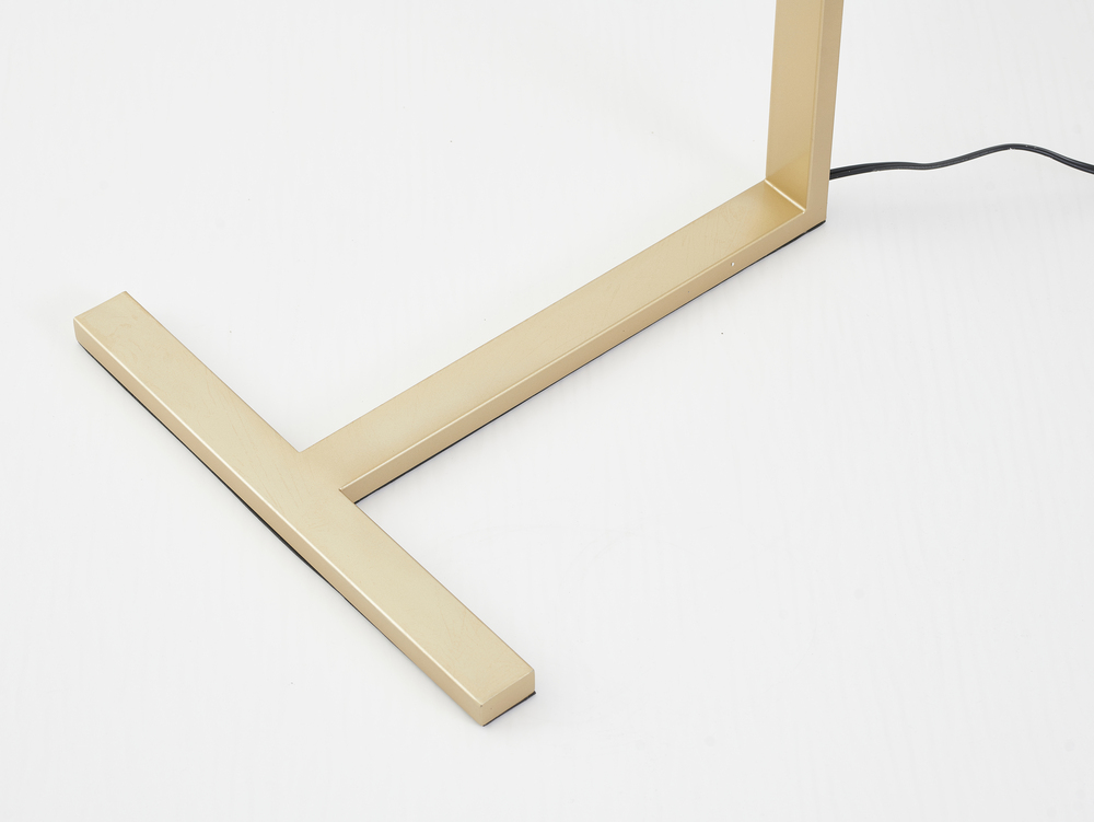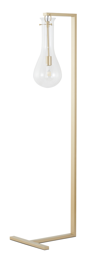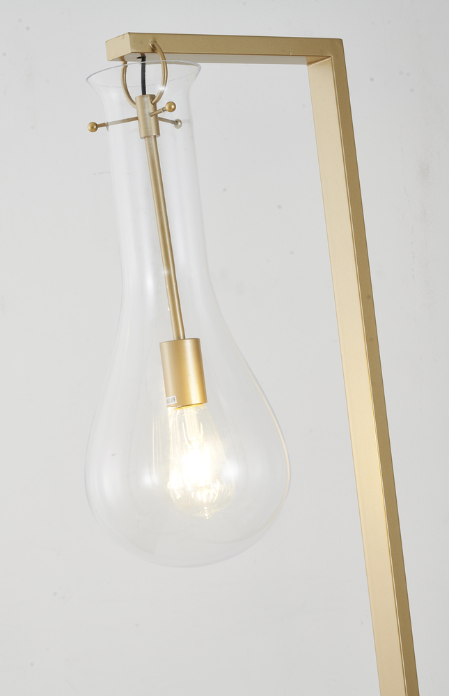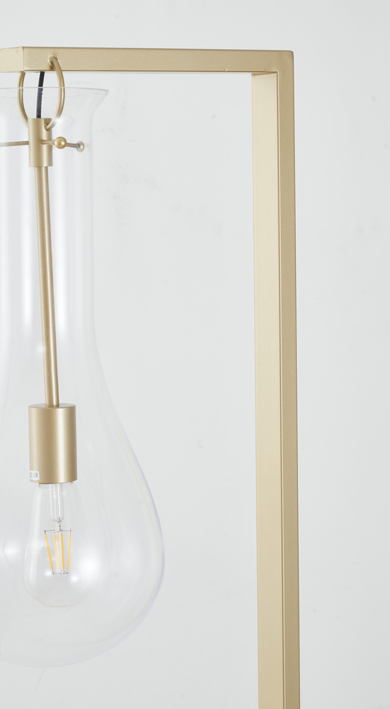 This floor lamp is a brass metal color frame floor lamp. It comes with a clear tear drop glass shade. The materials for this floor lamp consists of iron and glass.