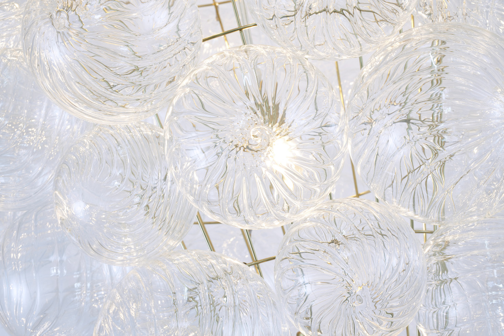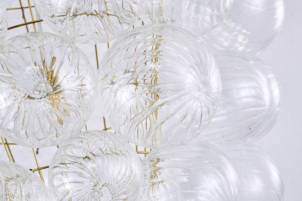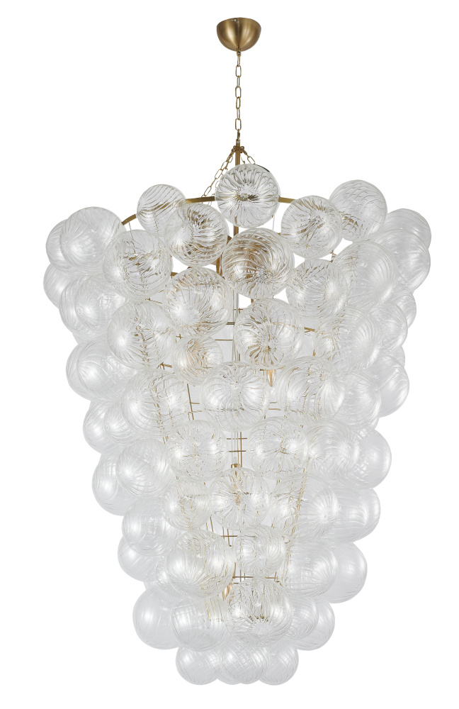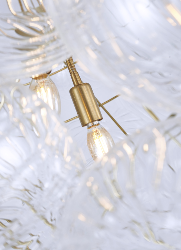This chandelier is a brass frame chandelier. It comes with clear glass swirl shades. The chain length of 72 inches is provided and the chain length is adjustable.