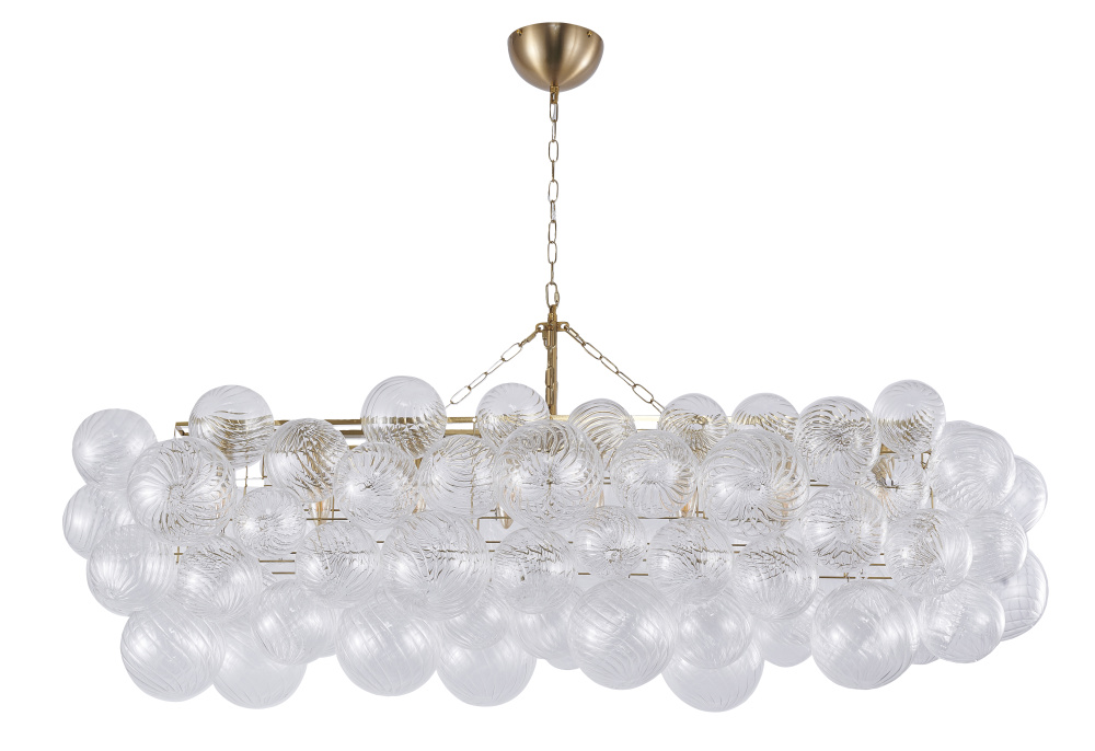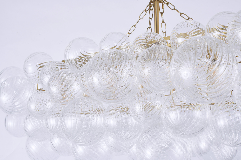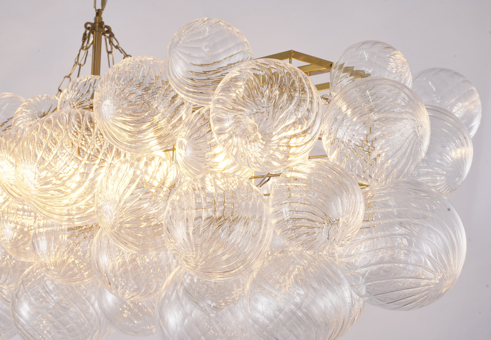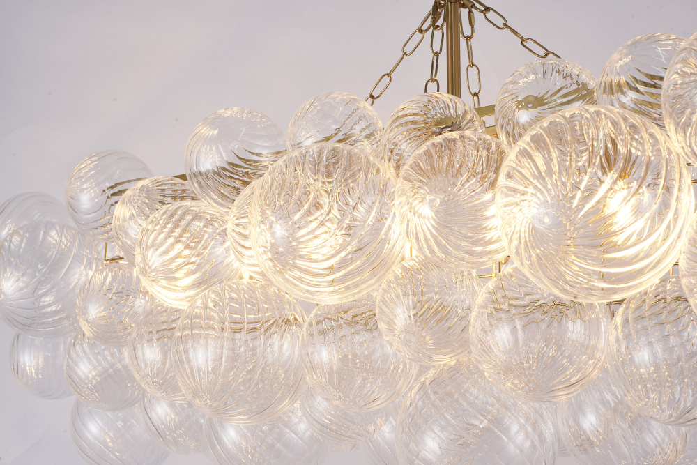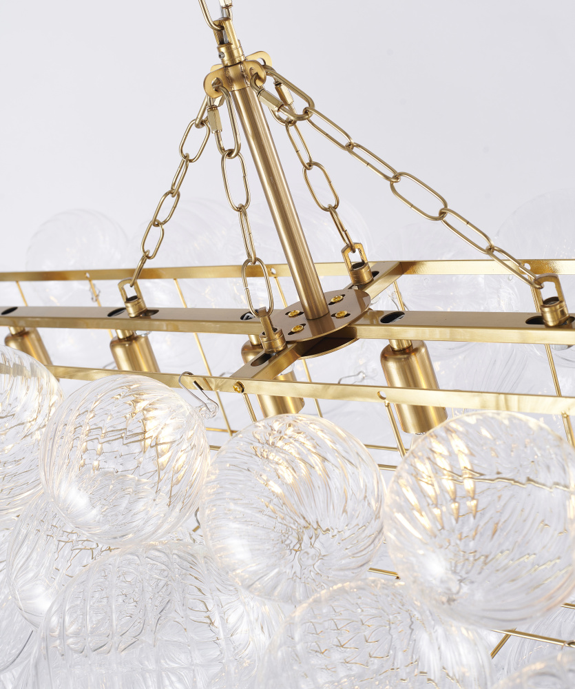 This chandelier is a brass frame chandelier. It comes with clear glass swirl shades. The chain length of 60 inches is provided and the chain length is adjustable.