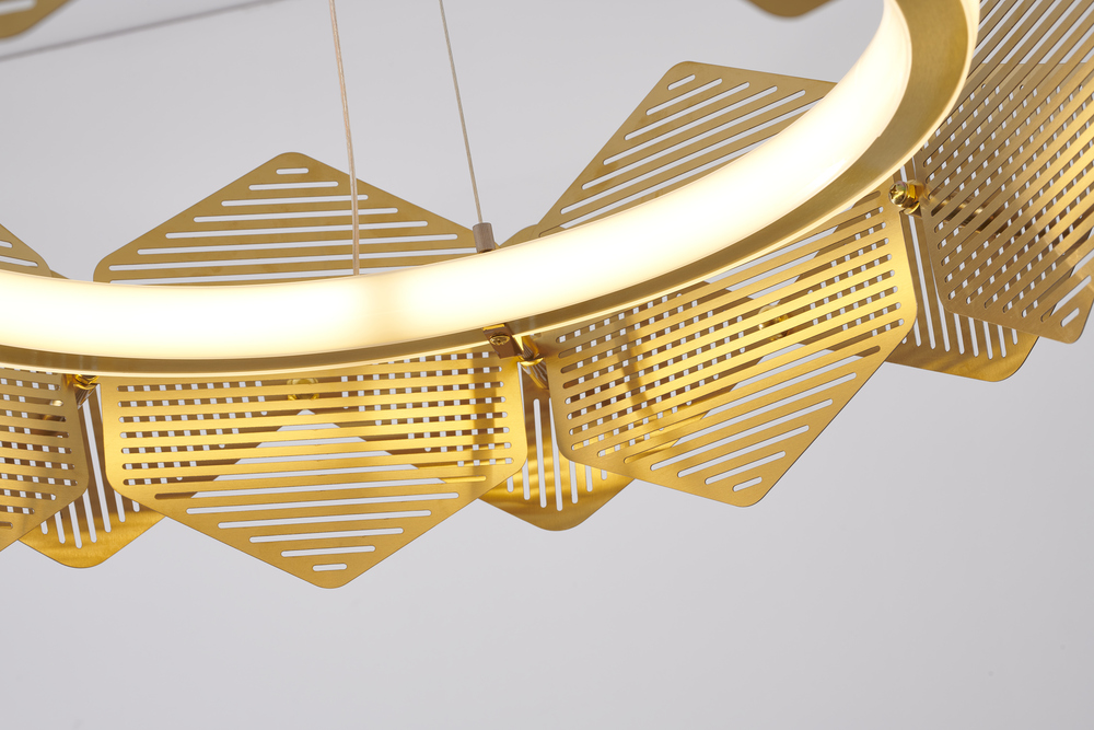 This LED chandelier is a brass halo ring chandelier