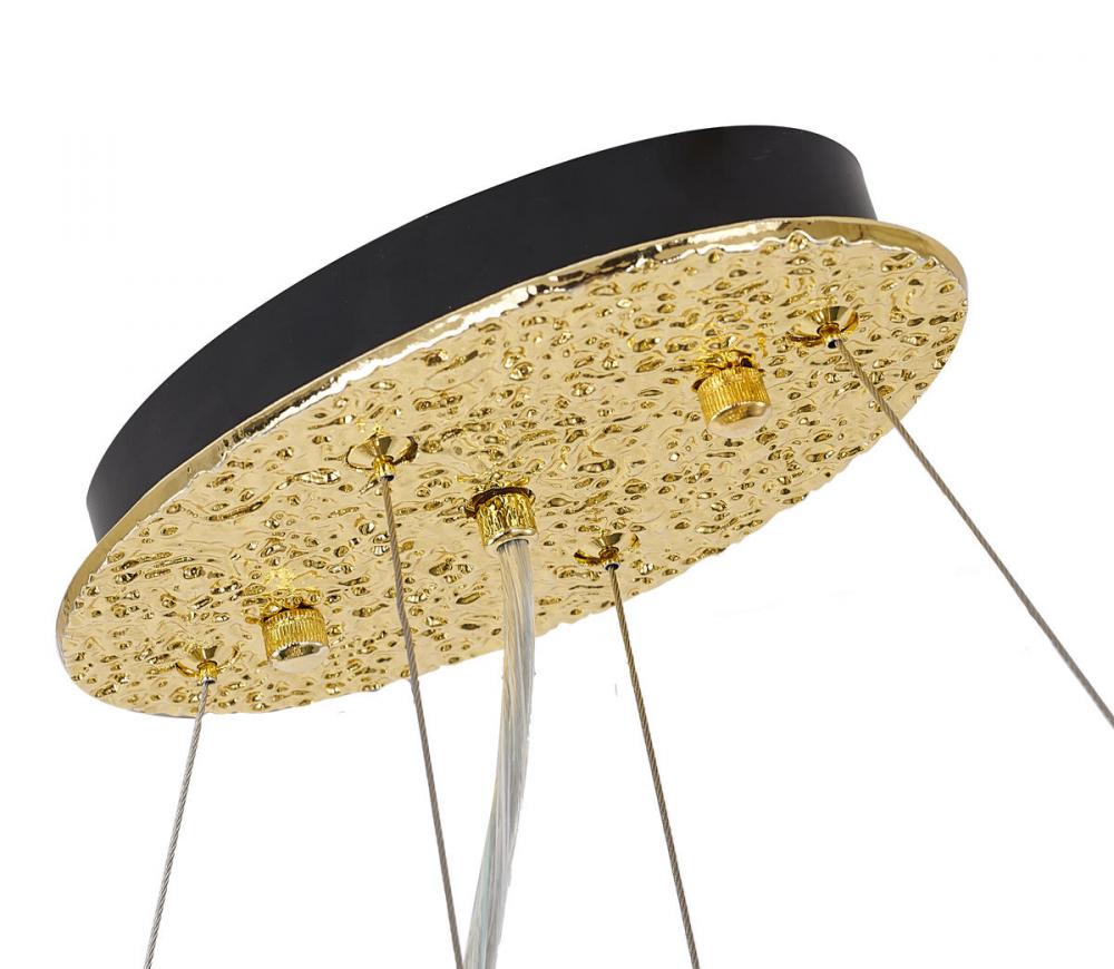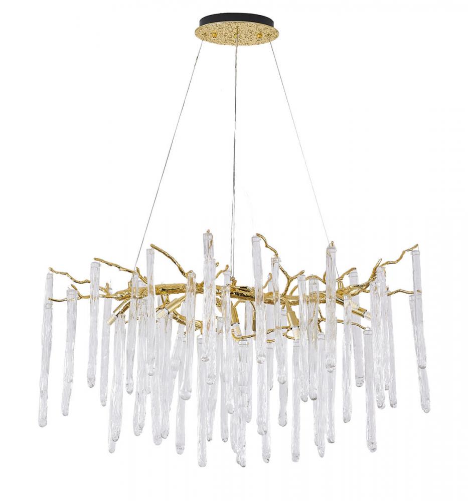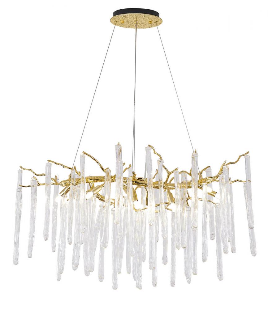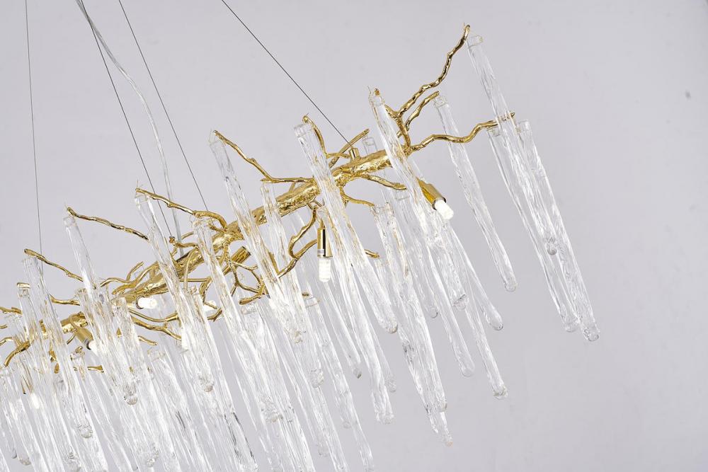 This exquisite chandelier is in a solid brass finish. The frame is made out of Aluminum, and it comes with clear glass hanging drops. The adjustable cord links make this fixture suitable for most ceiling heights.