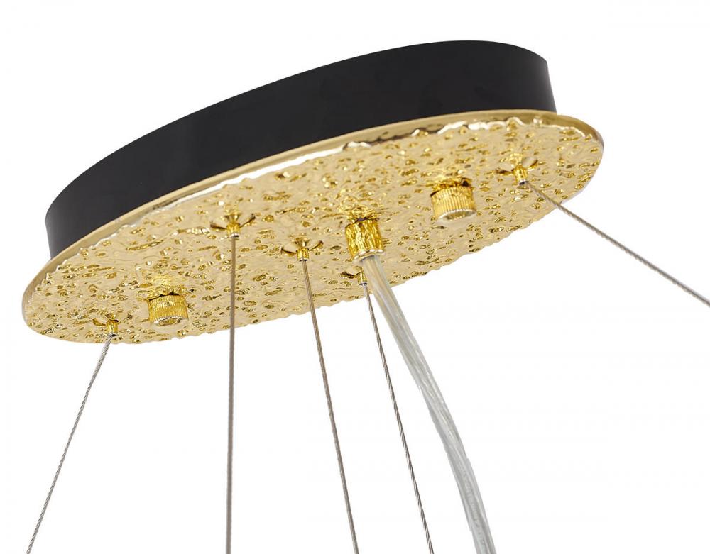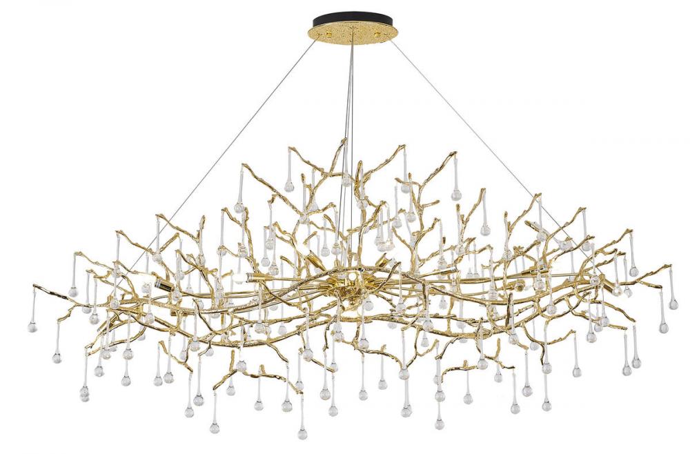 This exquisite chandelier is in a solid brass finish. The frame is made out of Aluminum, and it comes with clear glass hanging drops. The adjustable cord links make this fixture suitable for most ceiling heights.