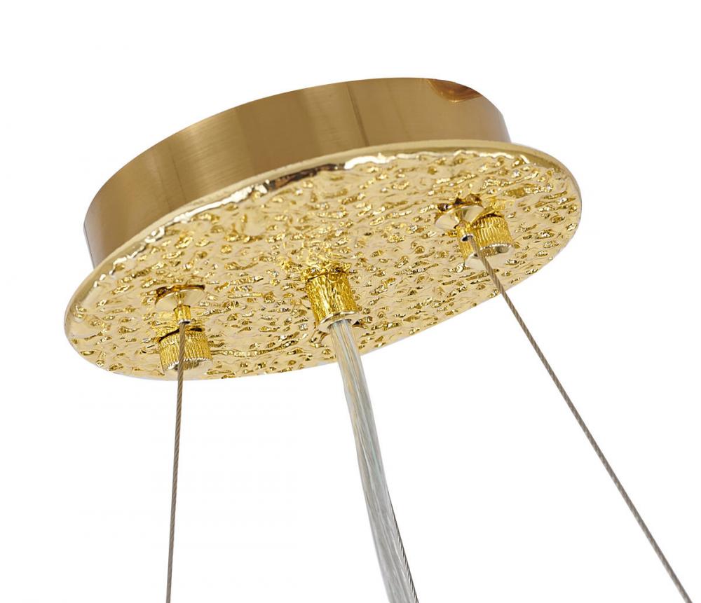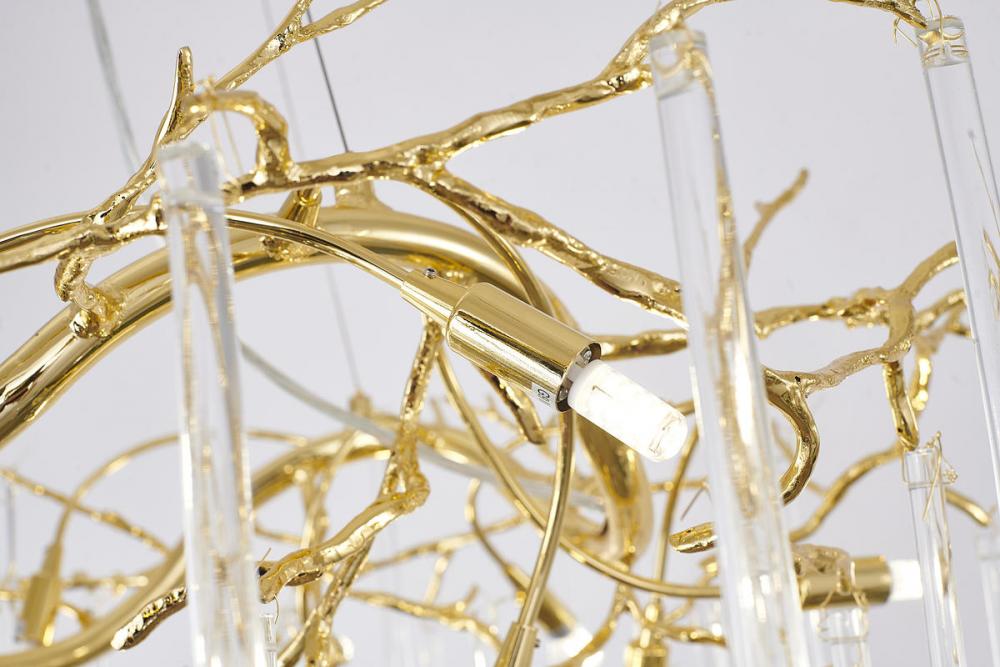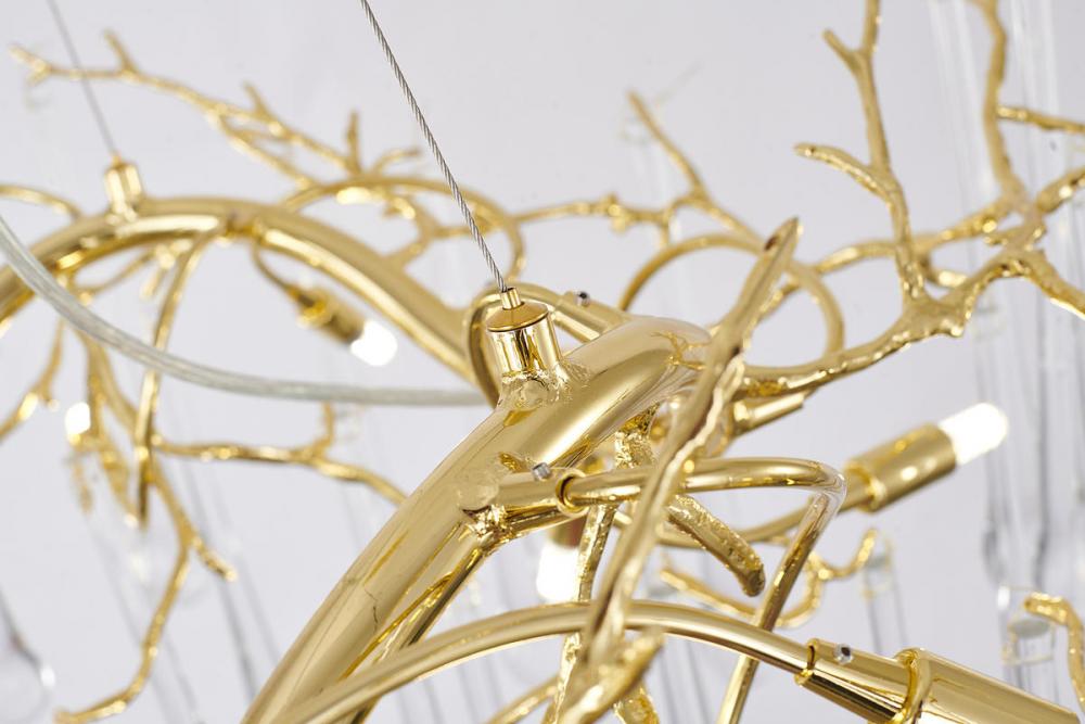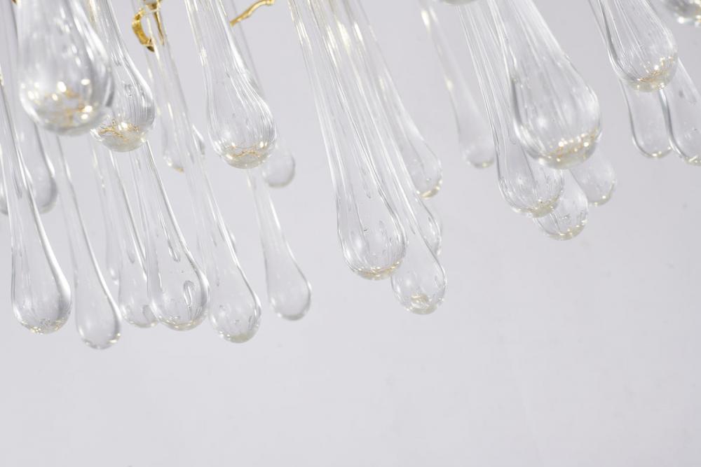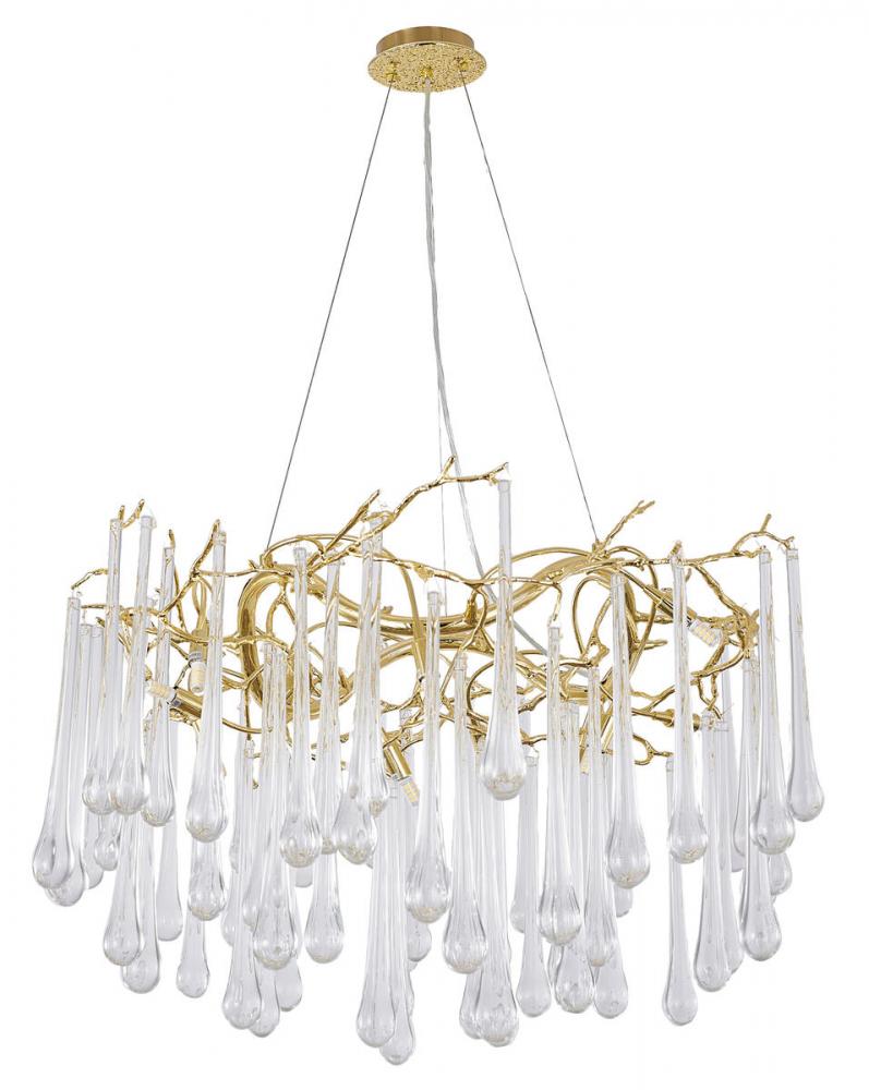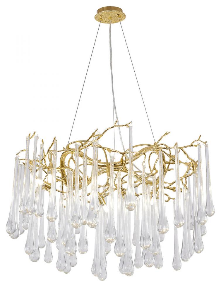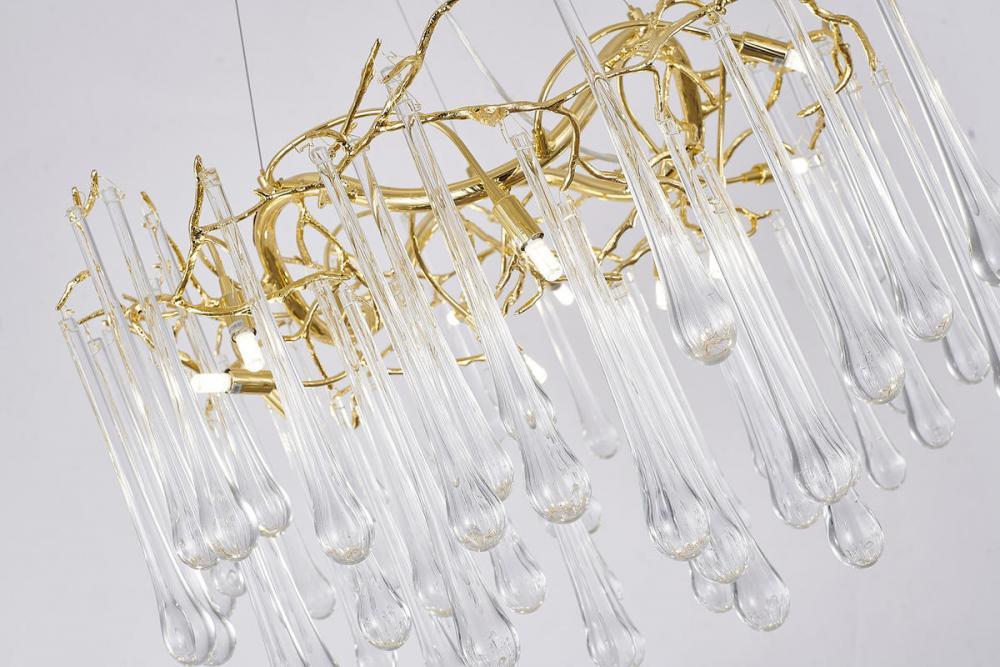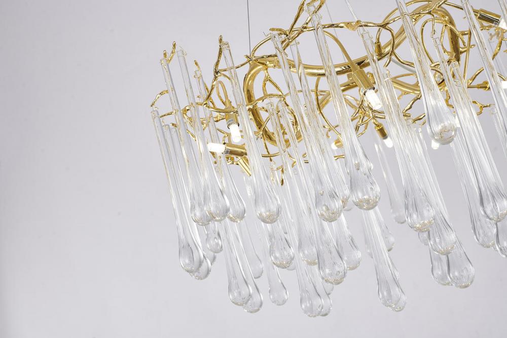 This exquisite chandelier is in a gold finish. The frame is made out of Aluminum, and it comes with clear glass hanging drops. The adjustable cord links make this fixture suitable for most ceiling heights.