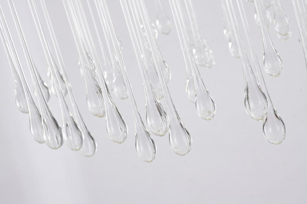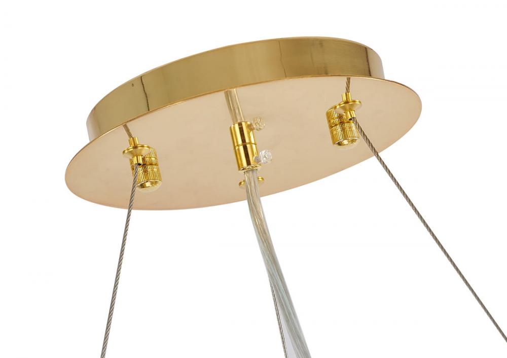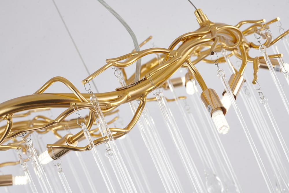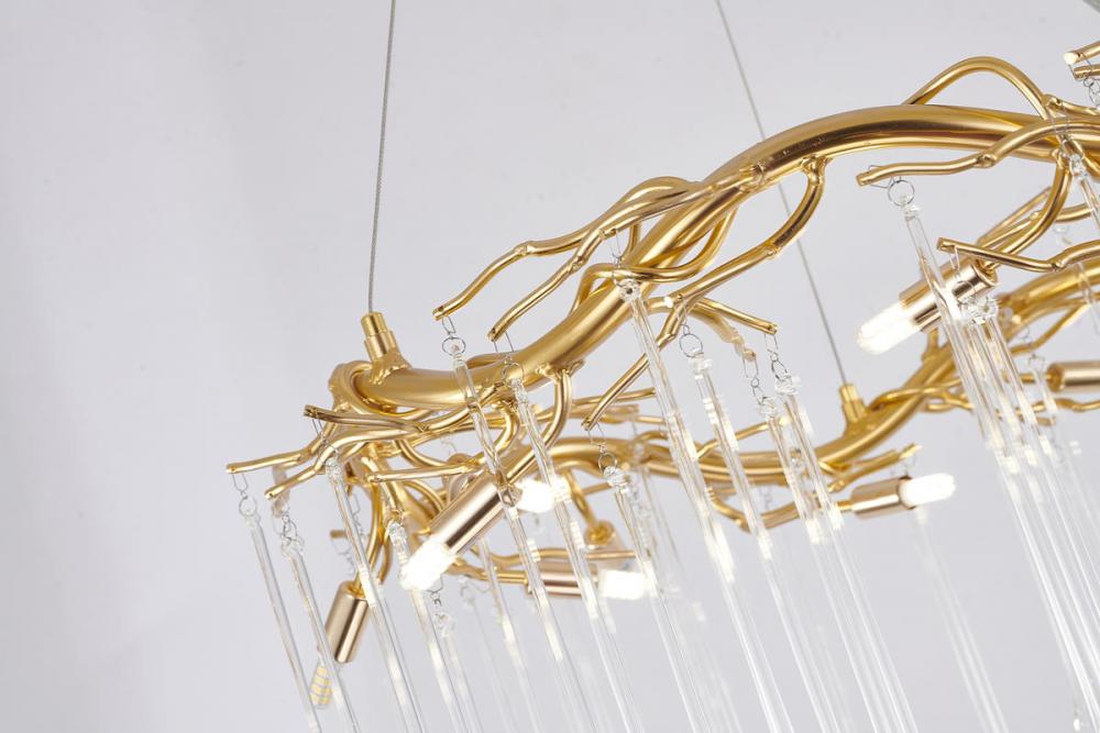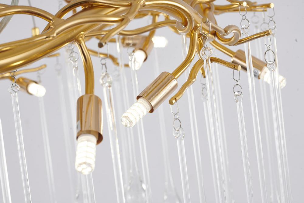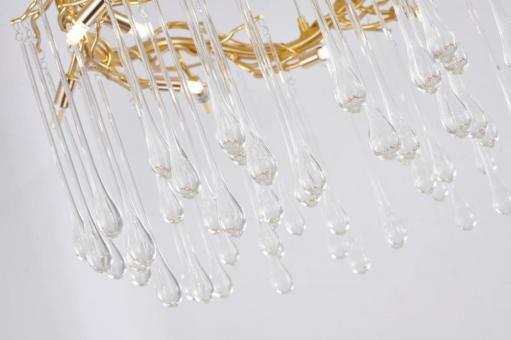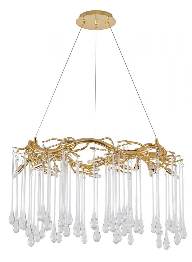 This exquisite chandelier is in a gold finish. The frame is made out of Aluminum, and it comes with clear glass hanging drops. The adjustable cord links make this fixture suitable for most ceiling heights.